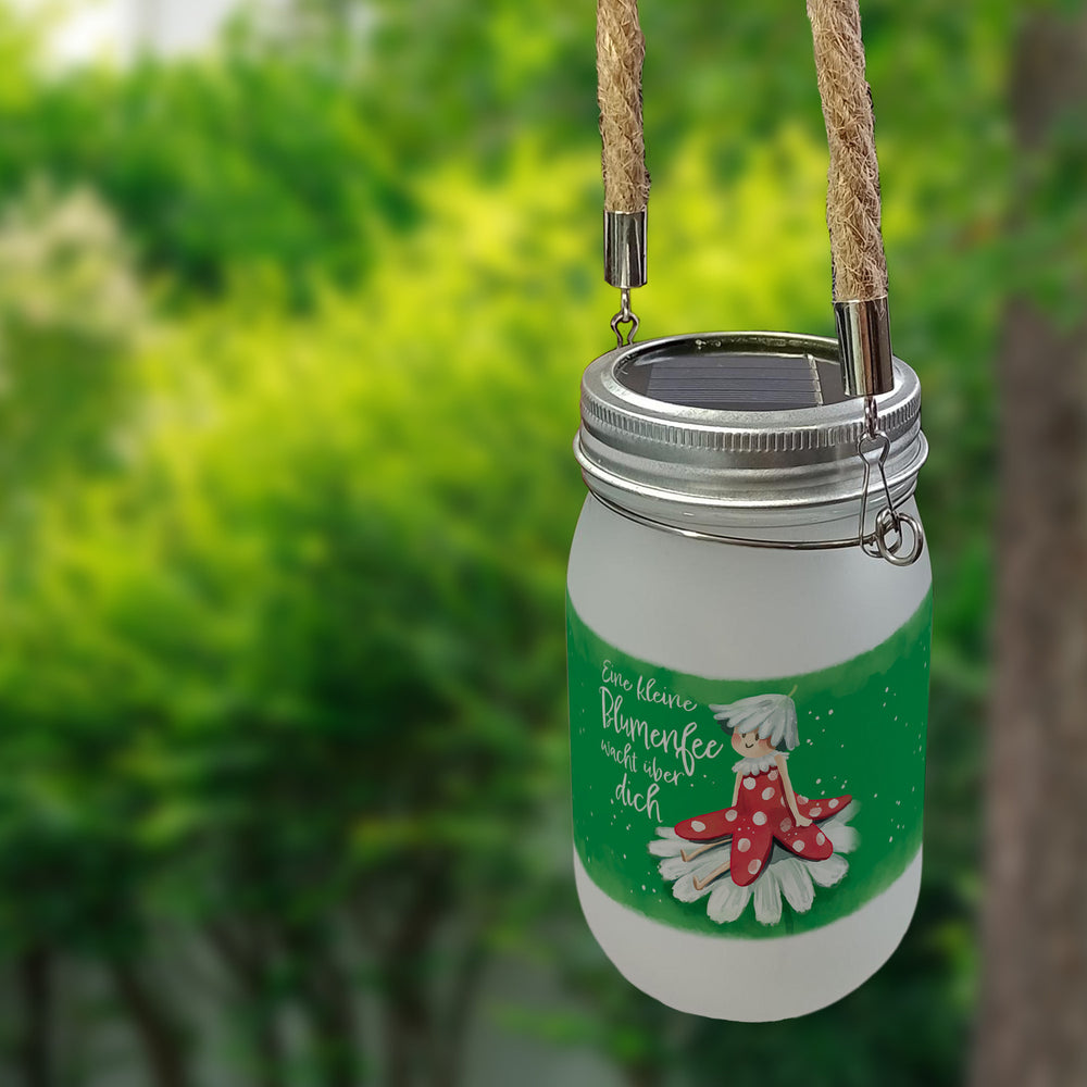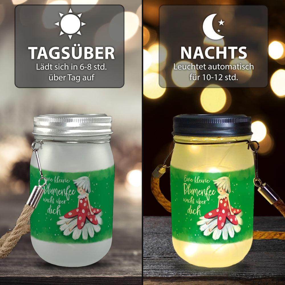 • Unser Solarlicht ist ein kleines Wunderwerk der Dekoration. In Form eines Einmachglases mit nostalgischem Strickhenkel, sitzt eine zauberhafte Blumenfee auf einer Blume. Es ist ideal, um einen Hauch von Märchenzauber in Ihren Garten oder auf Ihren Fenstersims zu bringen und für ein gemütliches Ambiente zu sorgen.