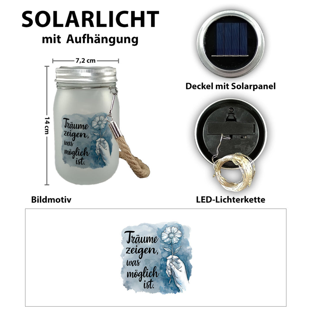 - Lieferumfang: 1x Blumenhand Solarlicht - Träume zeigen Möglichkeiten