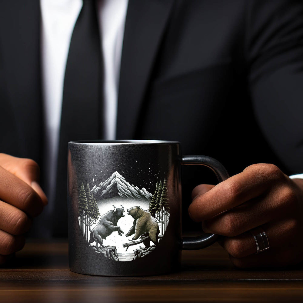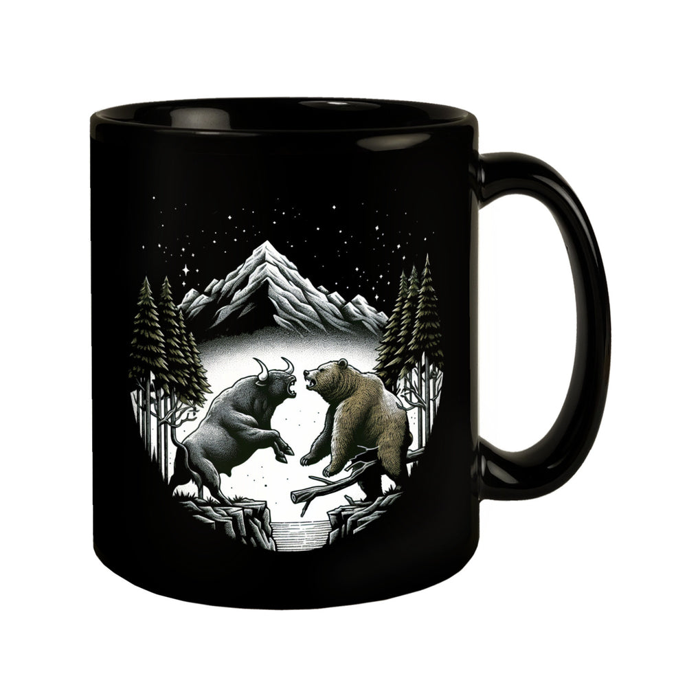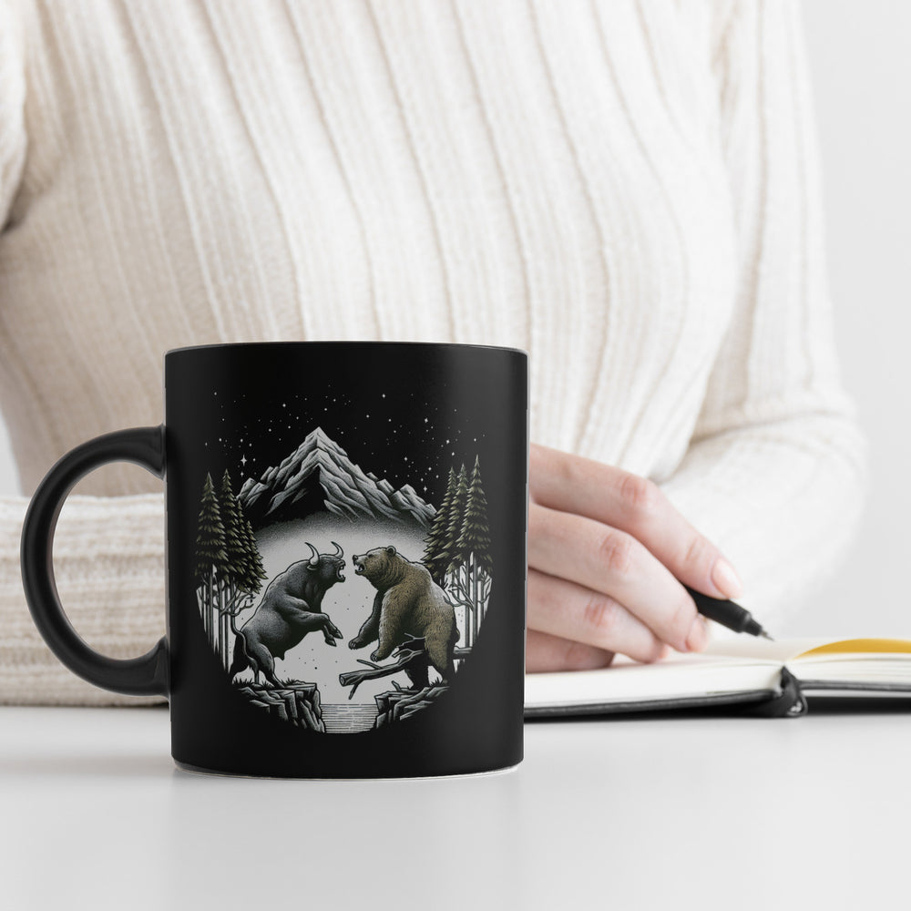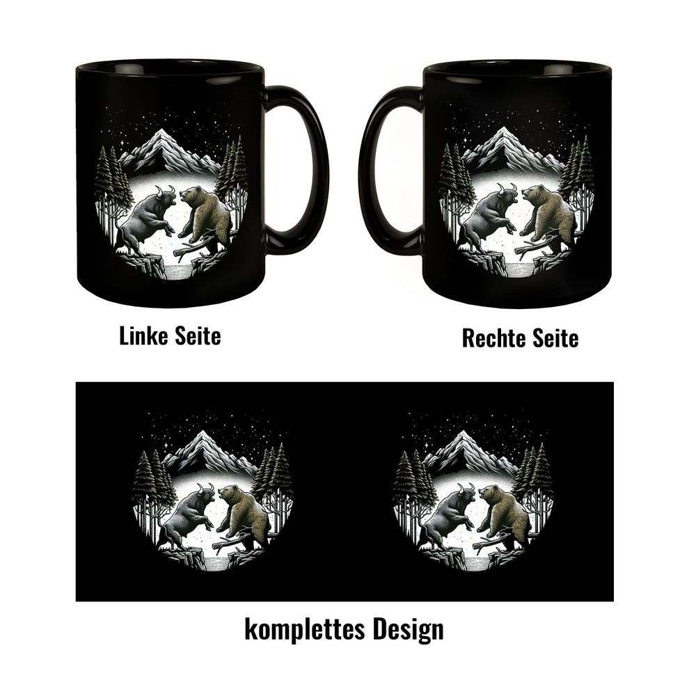 - Beim Schlürfen deines heißgeliebten Börsenbraus strahlen dir im Mondschein zwei Giganten der Wildnis entgegen. Stier und Bär, in einem mondbeleuchteten Waldgebirge, ringen um die Vorherrschaft an der Wall Street – ein tierischer Kampf direkt auf deiner neuen Lieblingstasse!
