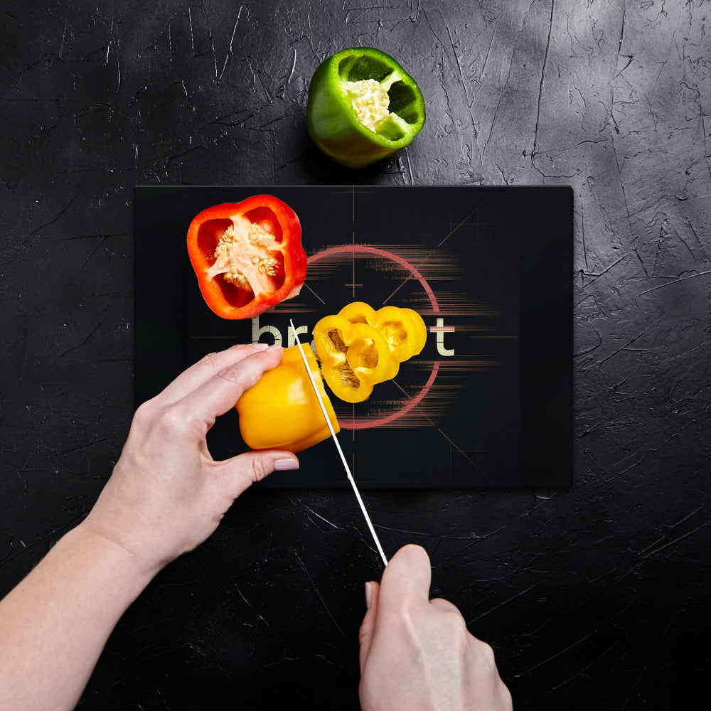 • Das bratort Fadenkreuz Schneidebrett zeigt ein beeindruckendes, digitales Design mit dem Text "bratort" in abgenutzten Buchstaben auf einem tiefschwarzen Hintergrund. Ein pixeliges, karmesinrotes Fadenkreuz verleiht dem Brett einen bedrohlichen, kriminellen Charme. Perfekt für Hobbyköche und Tatort-Fans, die es spannend und ungewöhnlich mögen.