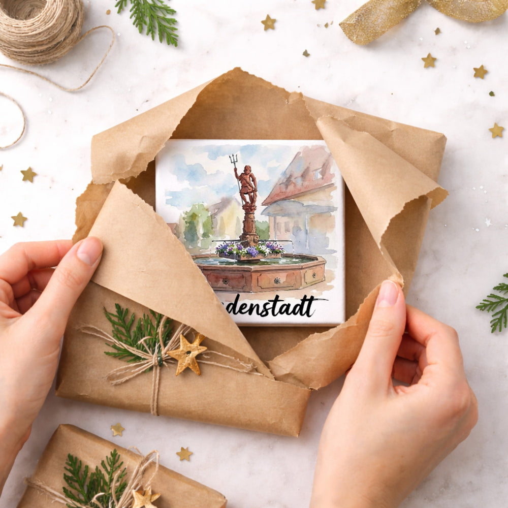 Brunnen Freudenstadt 6er Set Untersetzer aus Holz mit Aquarellmotiv