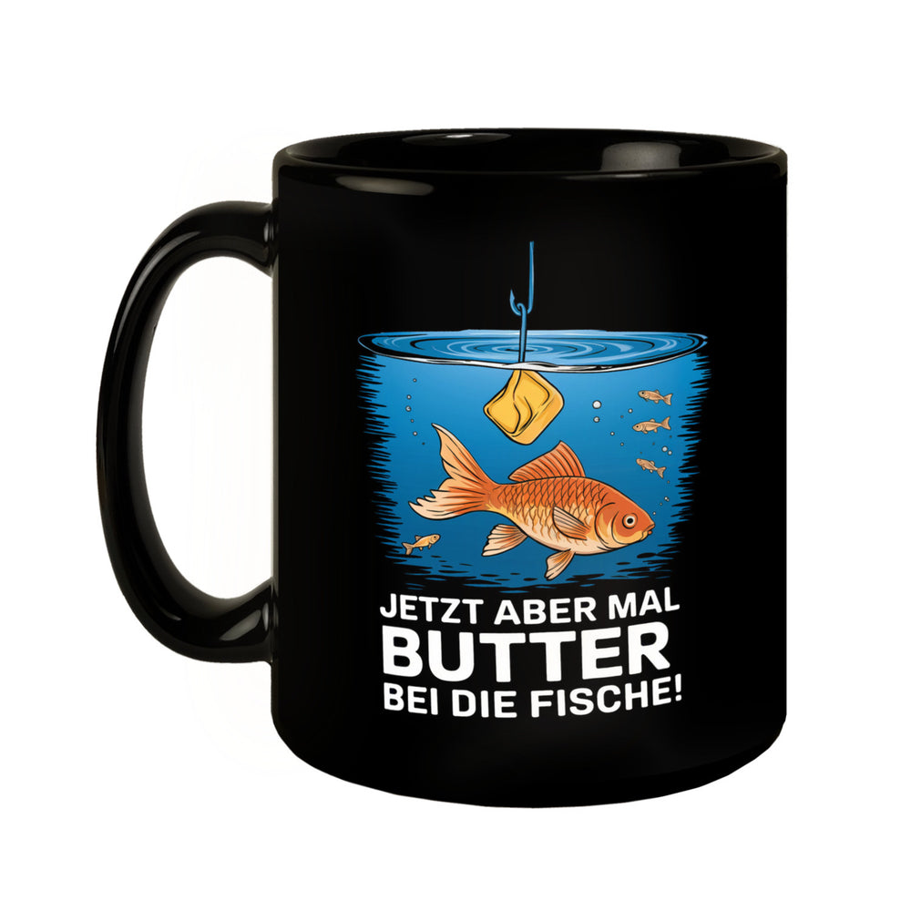 - Der goldene Fisch schnuppert an der Butter, während kleinere Fische neugierig zuschauen. Die Tasse trägt den Spruch: "Jetzt aber mal Butter bei die Fische!" und bringt das deutsche Arbeitsmotto auf lustige Weise zum Ausdruck. Ideal für den Kollegen, der stets die Butter aus dem Kühlschrank klaut!