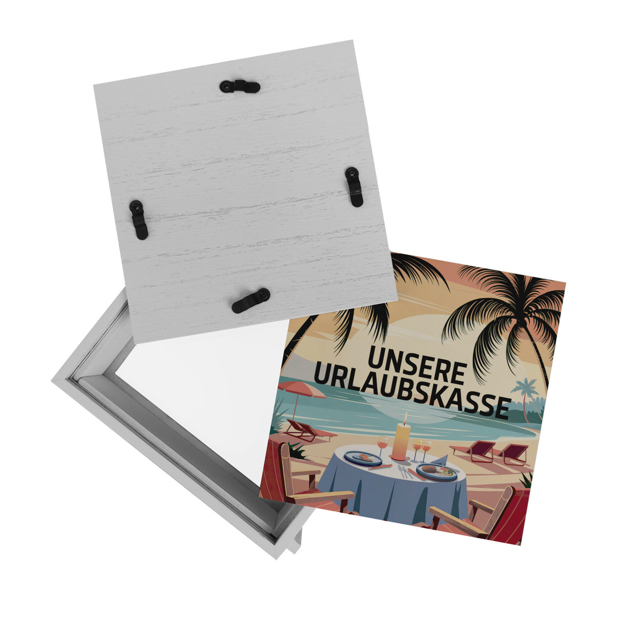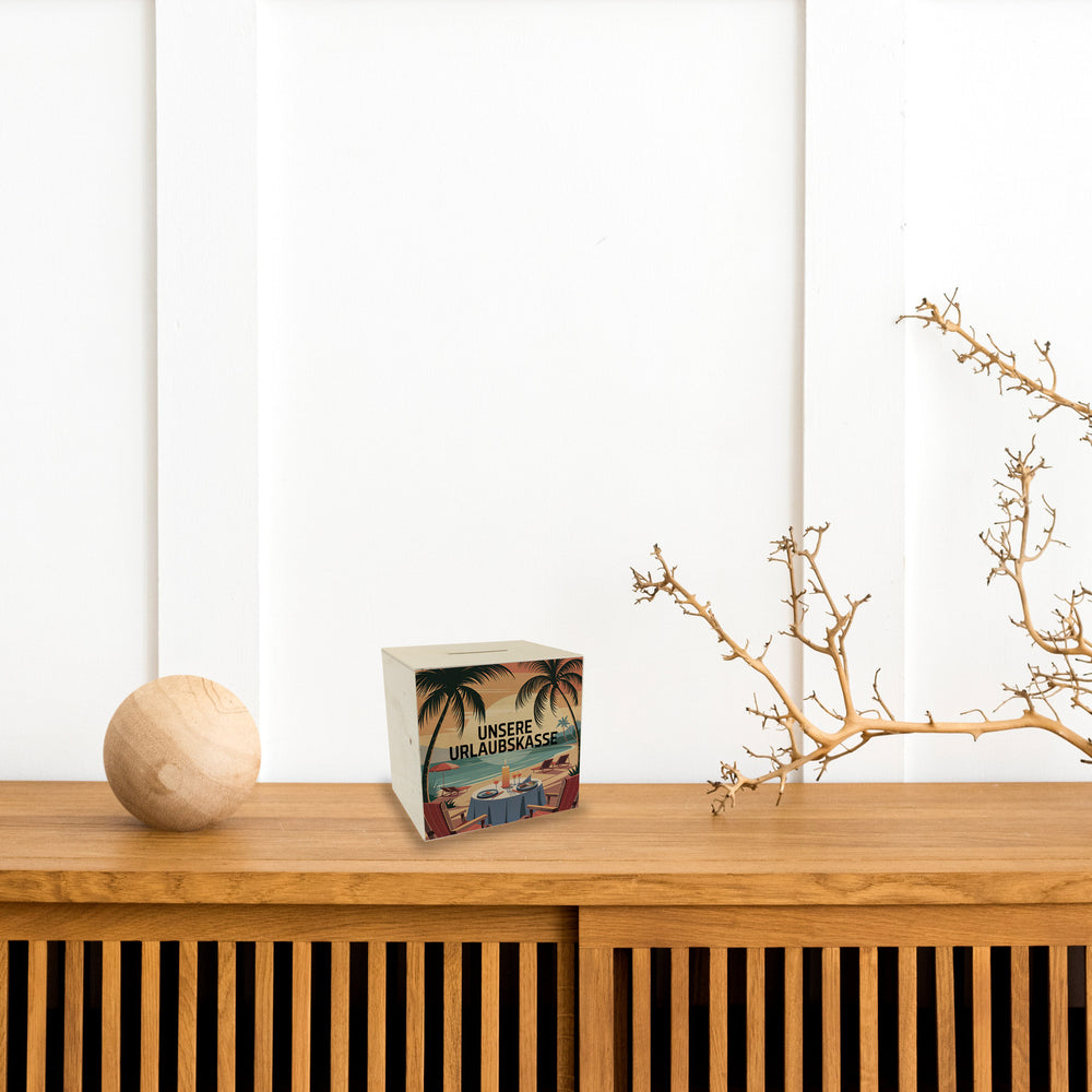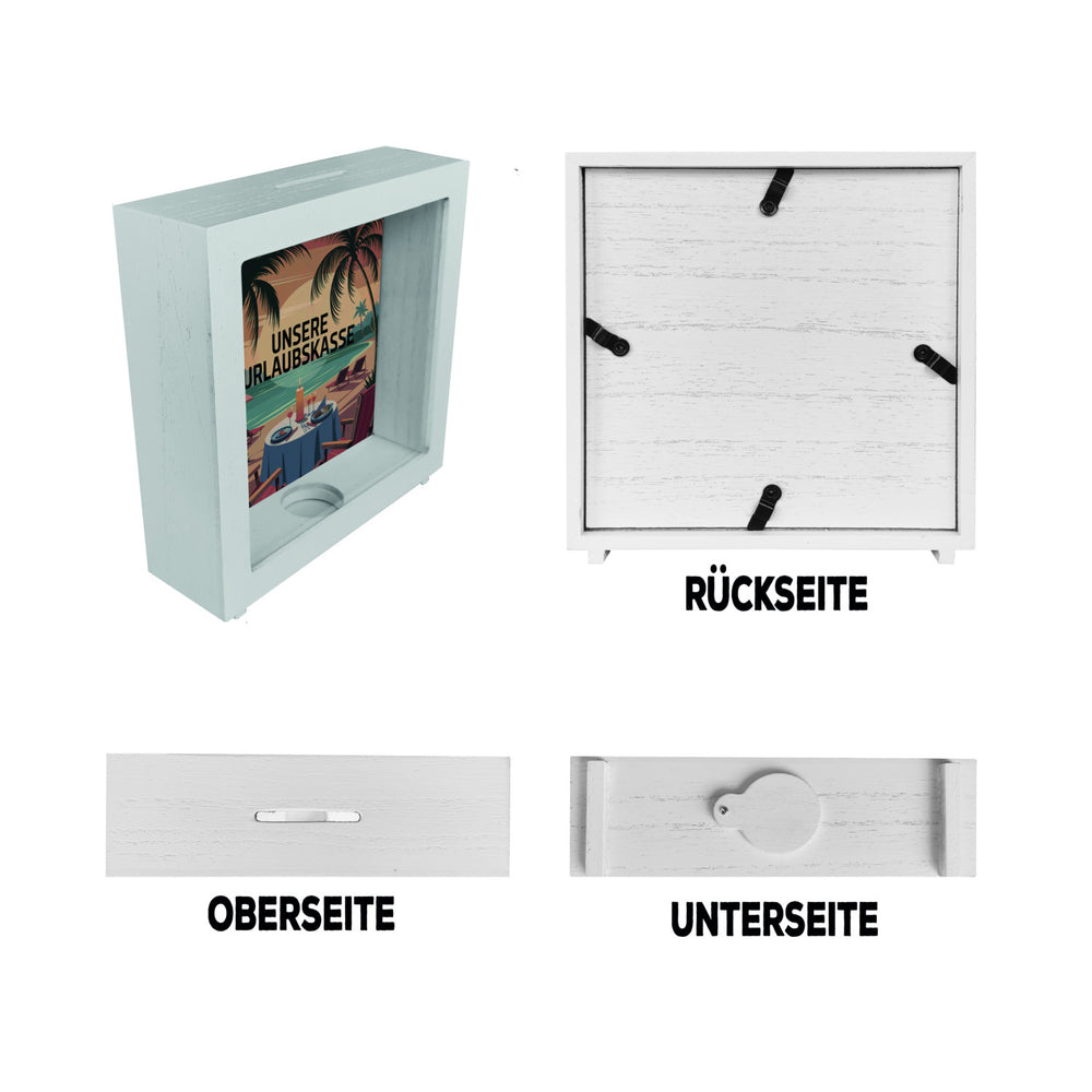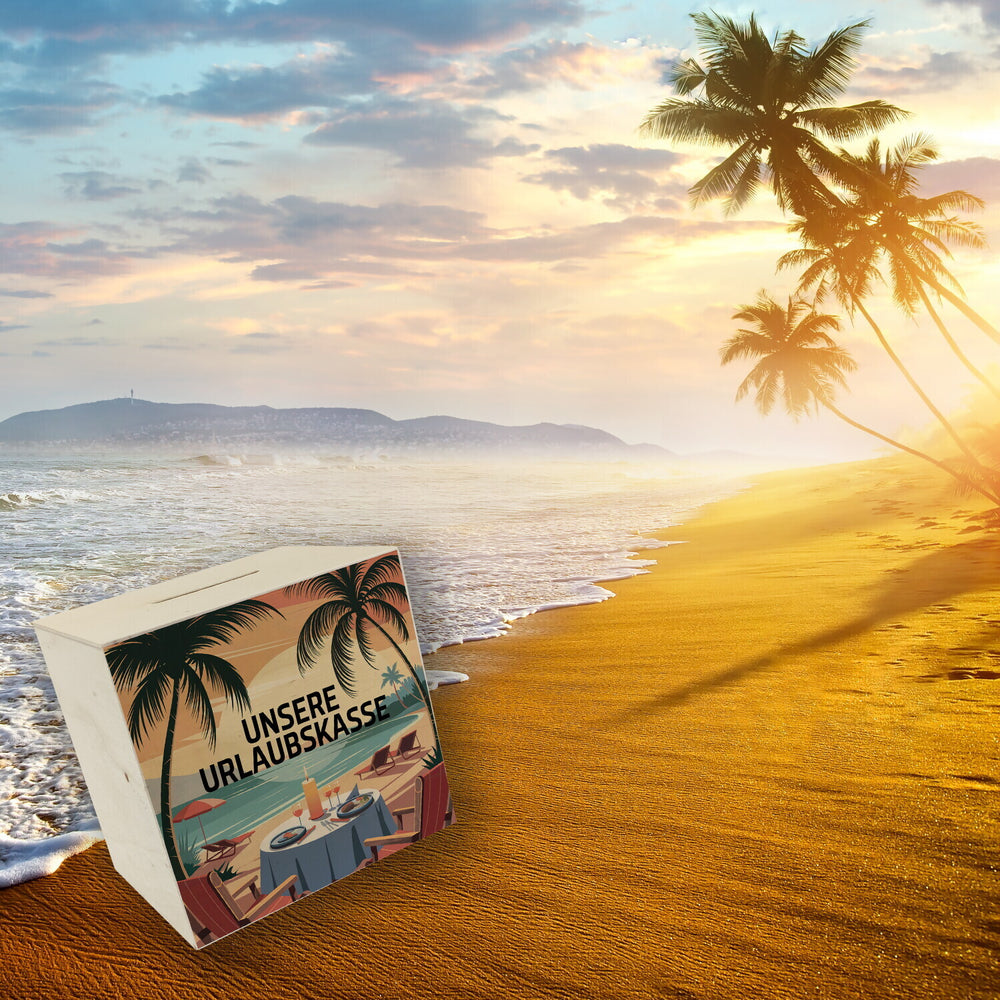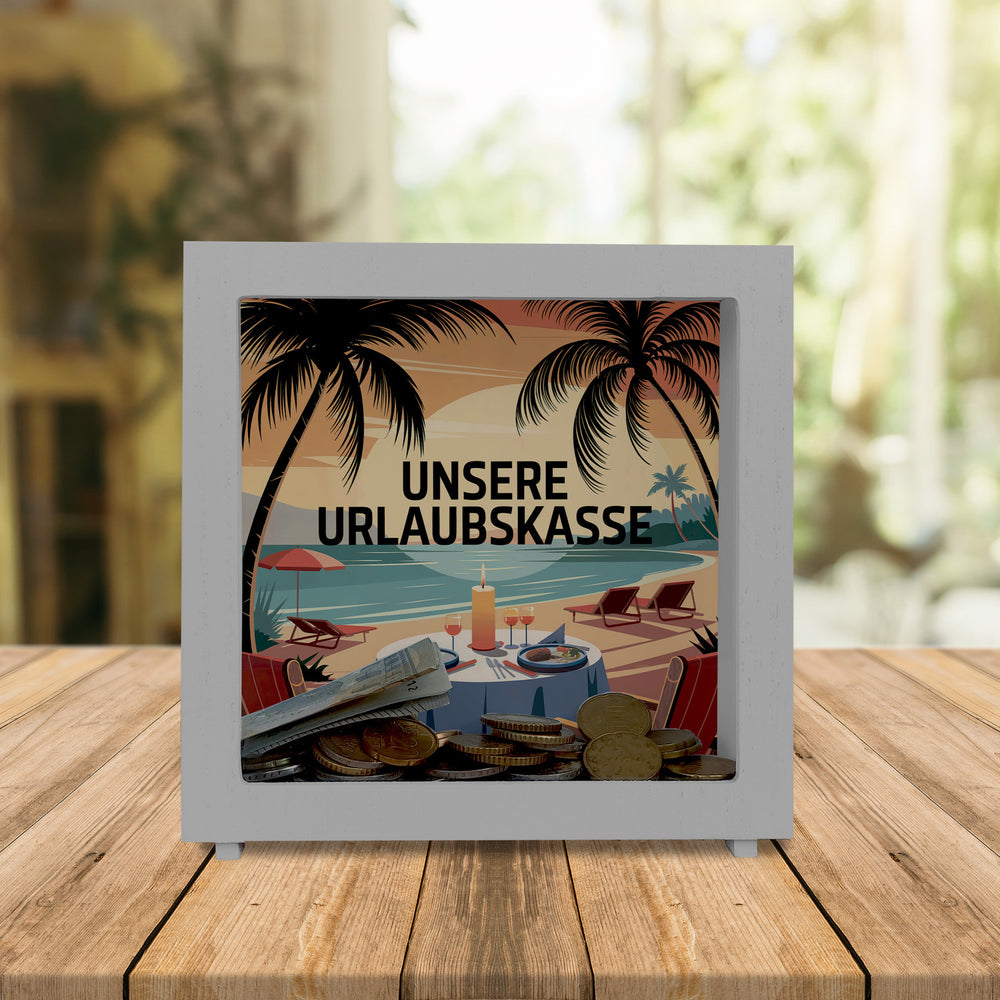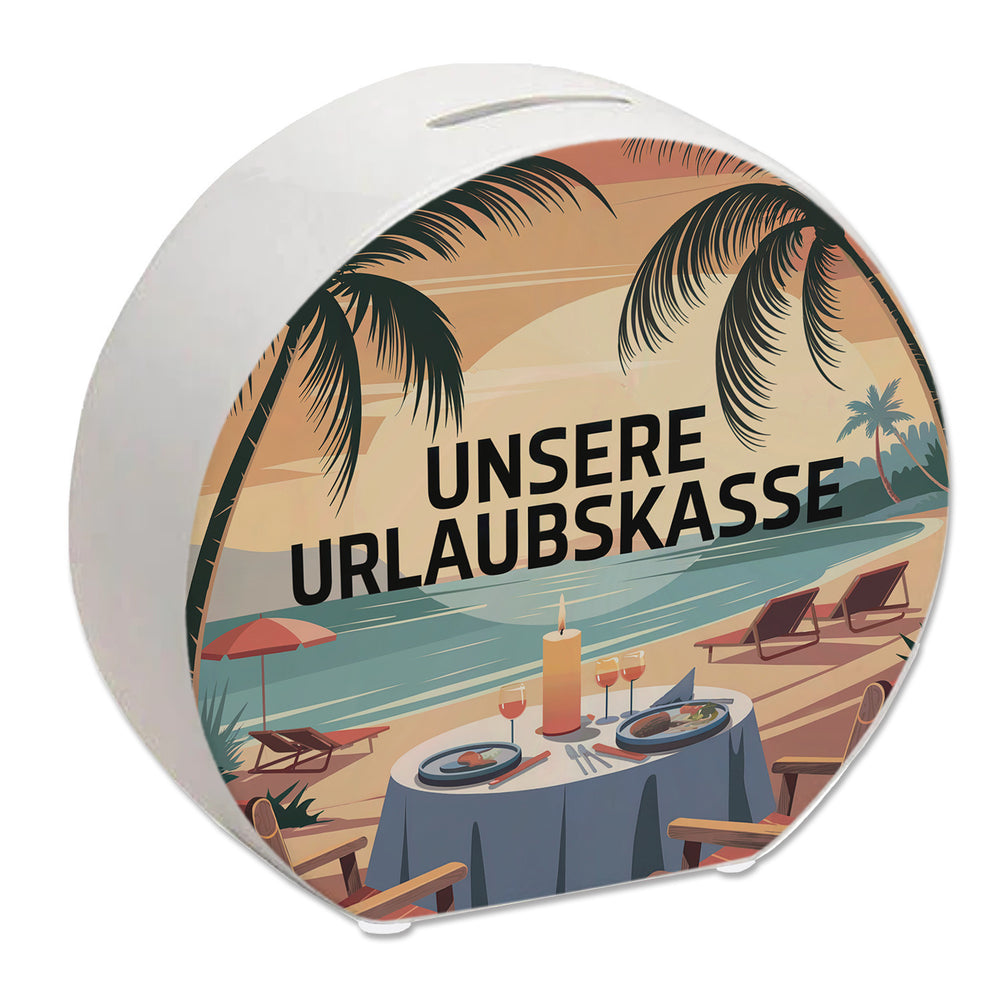 Träumen Sie von türkisblauen Wellen und romantischen Candlelight-Dinners unter Palmen? Mit unserer Candlelight-Dinner Urlaubskasse Spardose sind Sie nur noch ein paar Münzen entfernt! Diese Spardose ist nicht nur ein funktionaler Finanzhelfer, sondern auch ein stilvoller Motivator. Perfekt als Valentinstagsgeschenk, inspiriert sie jeden Tag, damit Ihr Traum vom Strandurlaub bald Wirklichkeit wird.Verfügbar in drei fantastischen Designs: eine schlichte Holzvariante für Minimalisten, eine elegante ovale Keramik-Version für Ästheten und eine exklusive Rahmen-Variante mit Sichtfenster für die ganz besonderen Geldgeschenke. Jede Spardose ist mit Liebe und Präzision in unserer deutschen Spardosen-Manufaktur bedruckt.Diese bezaubernde Urlaubskasse wird Ihre Vorstellungskraft beflügeln. Stellen Sie sich vor, wie Sie beim Sparen das beruhigende Plätschern der Wellen hören und den warmen Sand unter Ihren Füßen spüren. Jeder Cent, den Sie hineinwerfen, bringt Sie diesem romantischen Erlebnis einen Schritt näher.Schmücken Sie Ihr Zuhause mit diesem charmanten Accessoire und verschenken Sie nicht nur ein Stück Erinnerung, sondern auch ein Versprechen von gemeinsamen Abenteuern. Ideal für alle, die ihren Partner oder Freunde mit einem originellen Valentinstag- oder Geburtstagsgeschenk überraschen möchten. Sagen Sie es mit Herz und einem Hauch von Urlaubsflair: „Unsere Urlaubskasse“ – der perfekte Ort, um Ihre Träume zu verwirklichen!