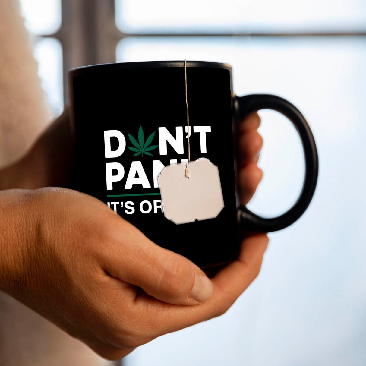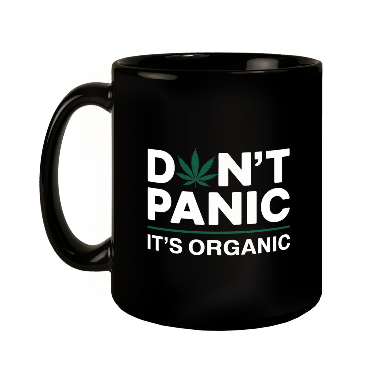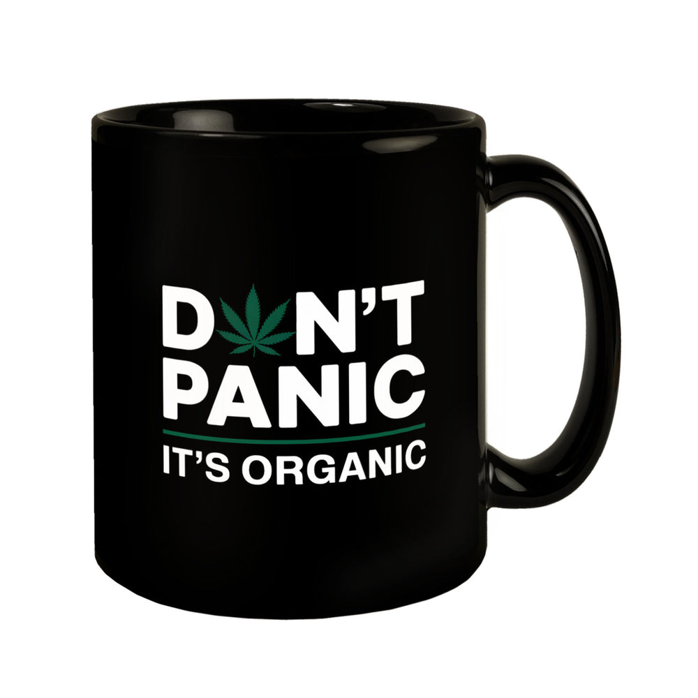 - Diese coole Tasse präsentiert ein schwarzes Design mit einem grünen Cannabisblatt oben und dem witzigen Spruch "DON'T PANIC IT'S ORGANIC" in weißer Schrift. Diese humorvolle Anspielung auf das bekannte Meme bringt sicherlich ein Schmunzeln auf jedes Gesicht!