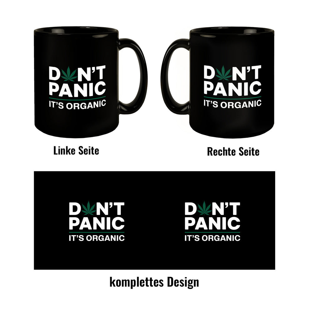 Diese coole Tasse präsentiert ein schwarzes Design mit einem grünen Cannabisblatt oben und dem witzigen Spruch "DON'T PANIC IT'S ORGANIC" in weißer Schrift. Diese humorvolle Anspielung auf das bekannte Meme bringt sicherlich ein Schmunzeln auf jed Hinweise: Fassungsvermögen: ca. 300ml