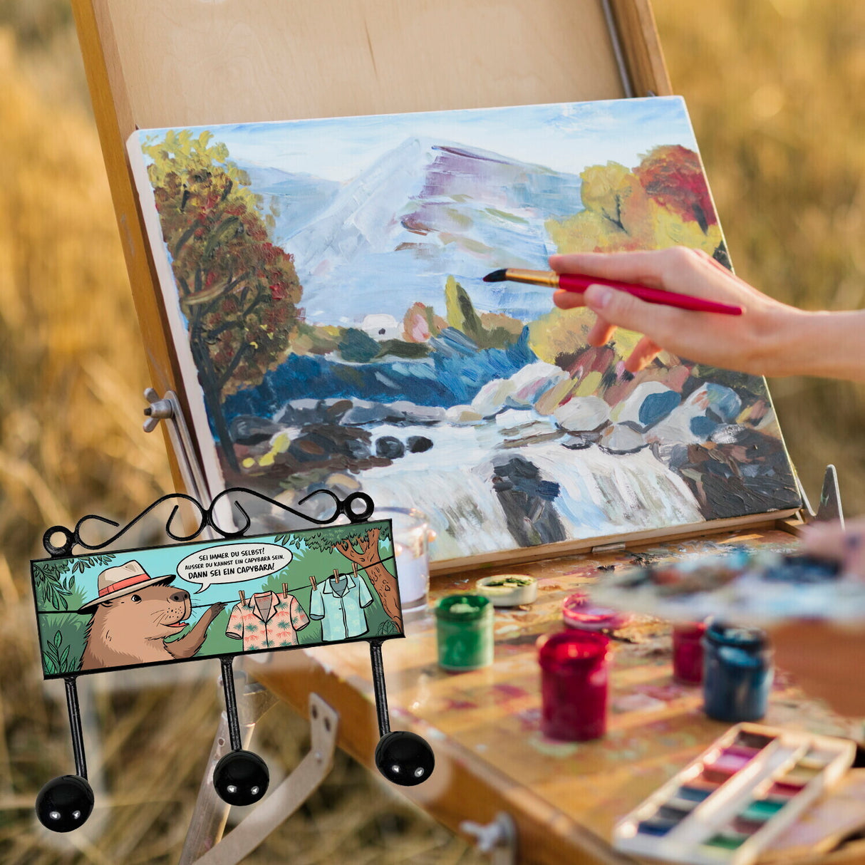 • Diese Kleiderhakenleiste zeigt ein cooles Capybara mit Hut, das lässig ein hawaiianisches Hemd im Wald aufhängt. Mit seinem farbenfrohen und lustigen Design bringt es einen Hauch von Humor und Natur in jedes Zuhause. Die große Sprechblase mit dem lustigen Spruch macht es besonders charmant.