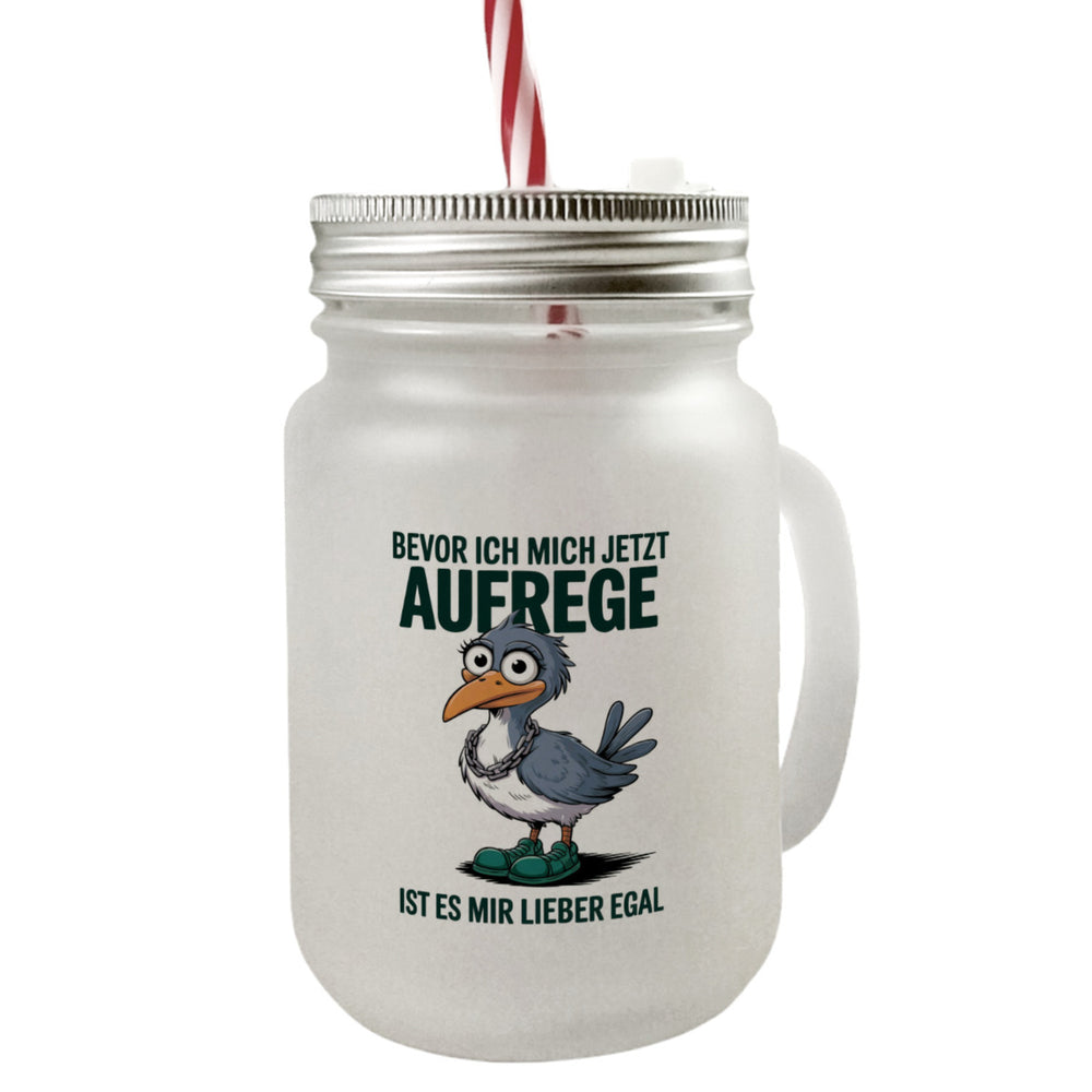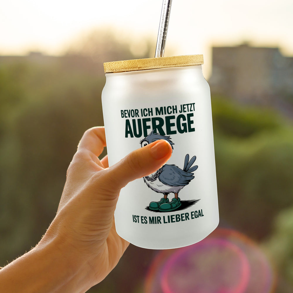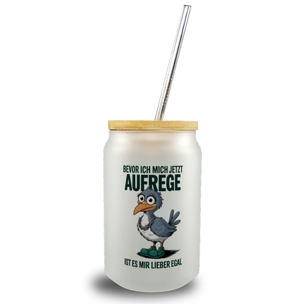 • Dieses Trinkglas präsentiert einen humorvollen Cartoon-Vogel mit großen Augen, einem langen orangefarbenen Schnabel und grauen Federn. Der Vogel trägt grüne Schuhe und eine Kette, während der freche Spruch "Bevor ich mich jetzt aufrege, ist es mir lieber egal" das Design komplettiert. Ein weißer Hintergrund verleiht dem Glas einen frischen Look.