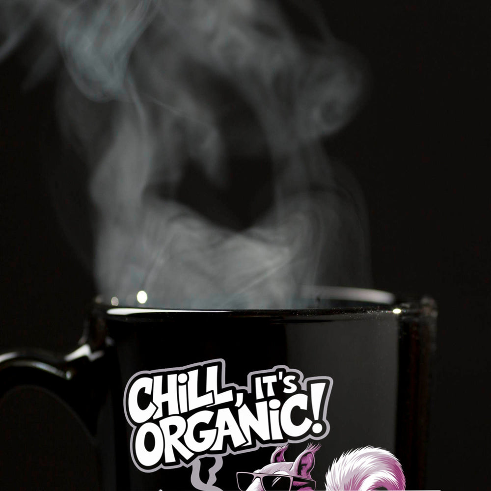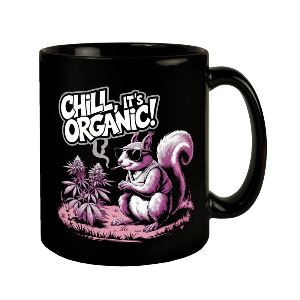 - Diese schwarze Tasse zeigt ein freches, bekifftes Eichhörnchen mit Sonnenbrille und Weste auf einer Cannabispflanze. Der lustige Spruch "Chill, it's organic!" prangt in cooler Graffiti-Schrift. Der Retro-Look im 80er-Jahre-Stil macht die Tasse zu einem echten Hingucker und sorgt für gute Laune beim Kaffeetrinken.