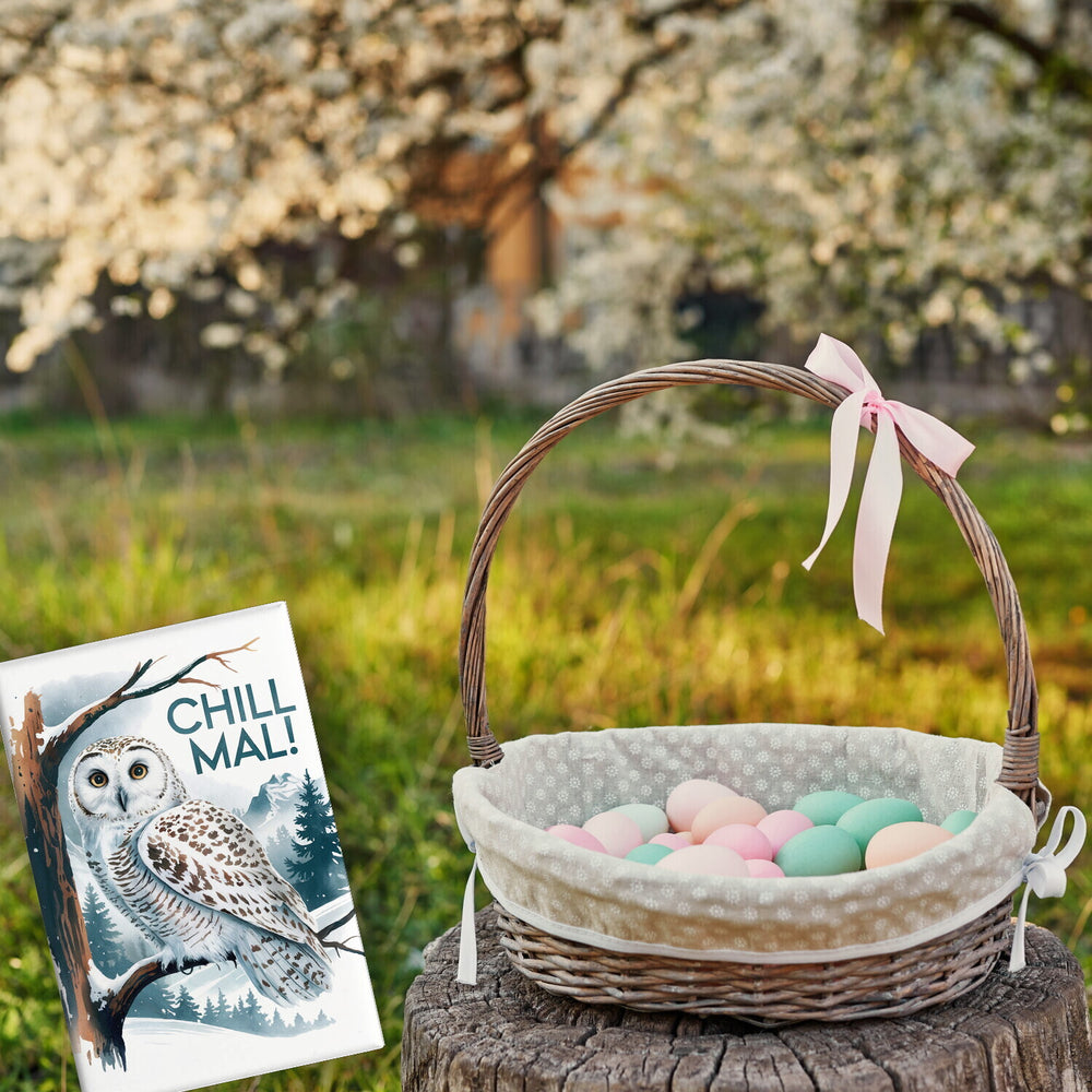 - Der rechteckige Magnet zeigt eine entspannte Schneeeule auf einem Ast vor einer ruhigen Winterlandschaft. Mit ihrem federweißen Gefieder, braunen Flecken und strahlend gelben Augen ist die Eule ein echter Hingucker. Die Worte "CHILL MAL!" in Großbuchstaben sorgen für einen humorvollen Touch und laden zum Entspannen ein.