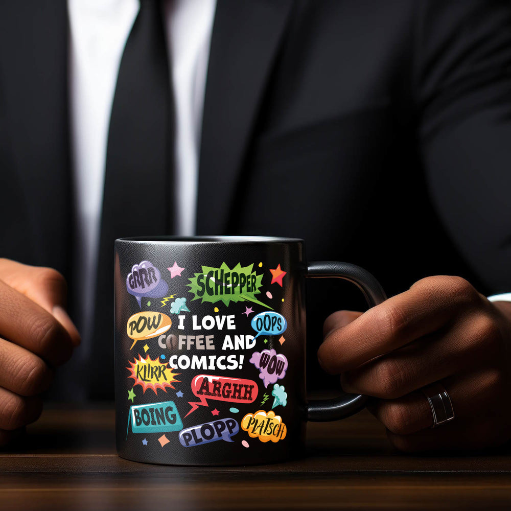 - Lieferumfang: 1x Comic Tasse in Schwarz mit Spruch: Love Comics and coffee