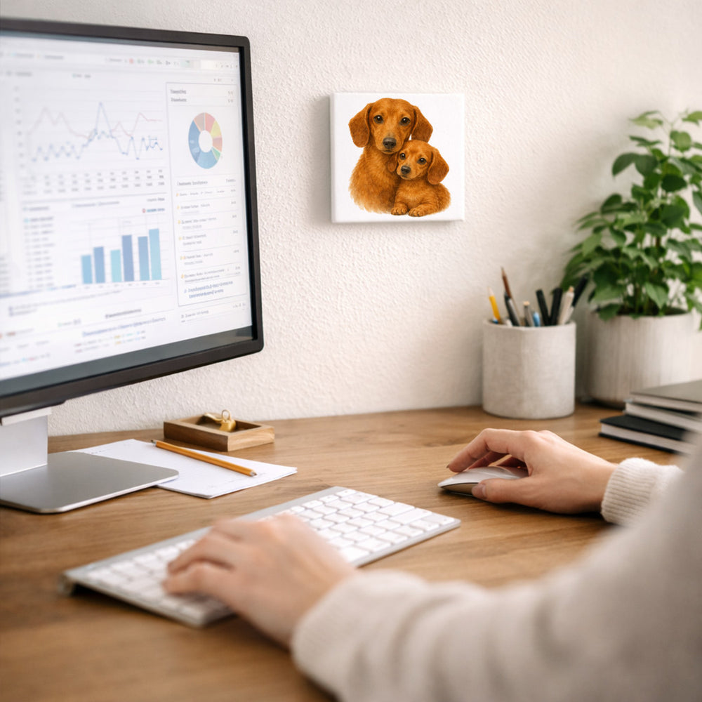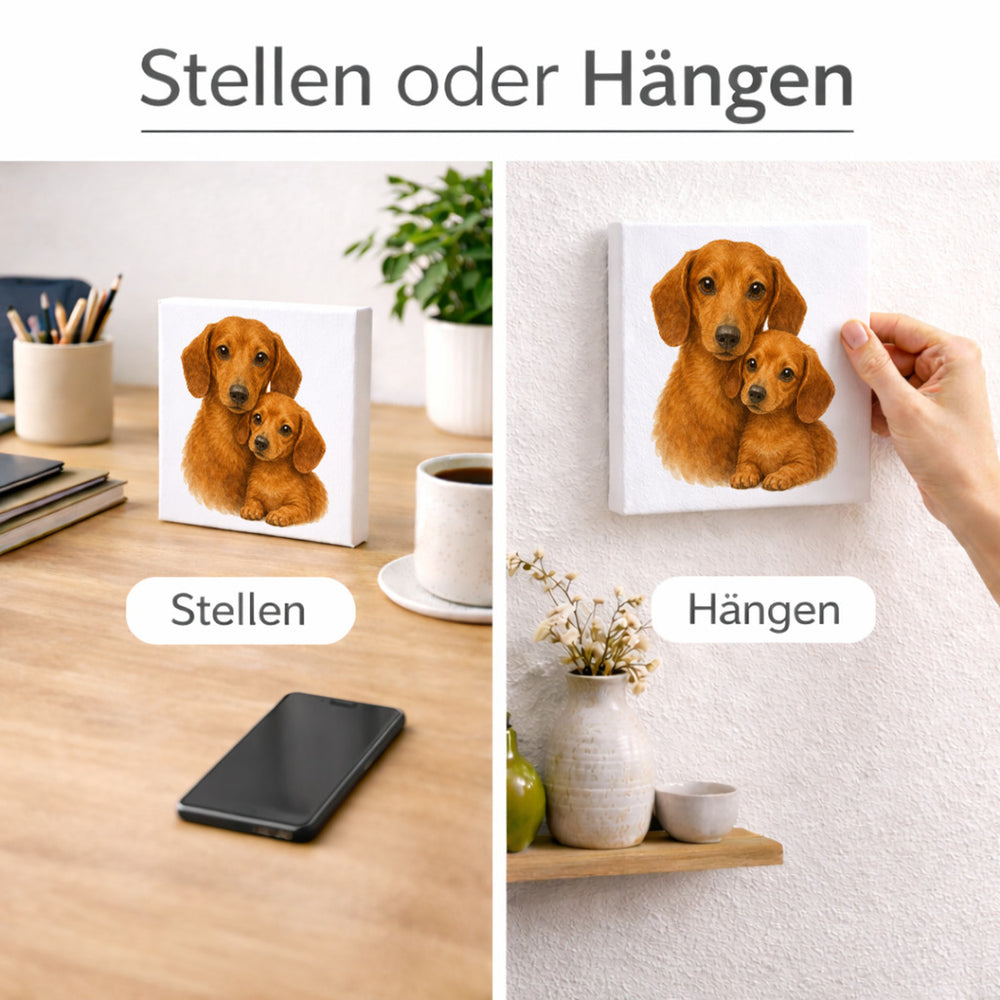 - Dieses charmante Holzbild zeigt einen entzückenden Dackel, der liebevoll mit seinem Welpen kuschelt. Der weiße Hintergrund hebt die detailreiche Illustration hervor, und das Bild versprüht eine harmonische Atmosphäre. Perfekt zum Stellen oder Hängen, bringt es den besonderen Charme von Hunden in jeden Raum.