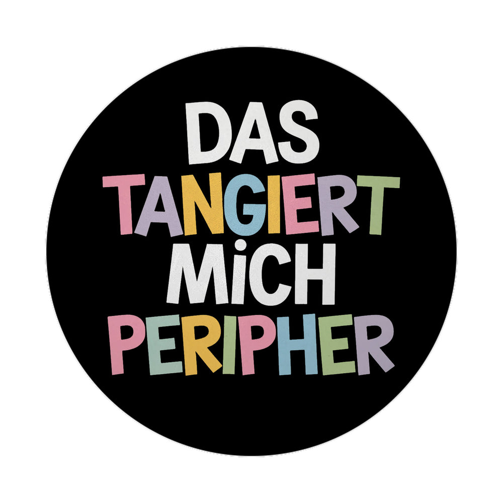 - Dieser runde Magnet zeigt den humorvollen Spruch "Das tangiert mich peripher" in einer bunten, comicartigen Schrift. Der schwarze Hintergrund lässt den farbenfrohen Text hervorstechen und verleiht ihm eine lebendige Ausstrahlung. Perfekt für einen fröhlichen Farbtupfer auf Kühlschrank oder Magnetwand!