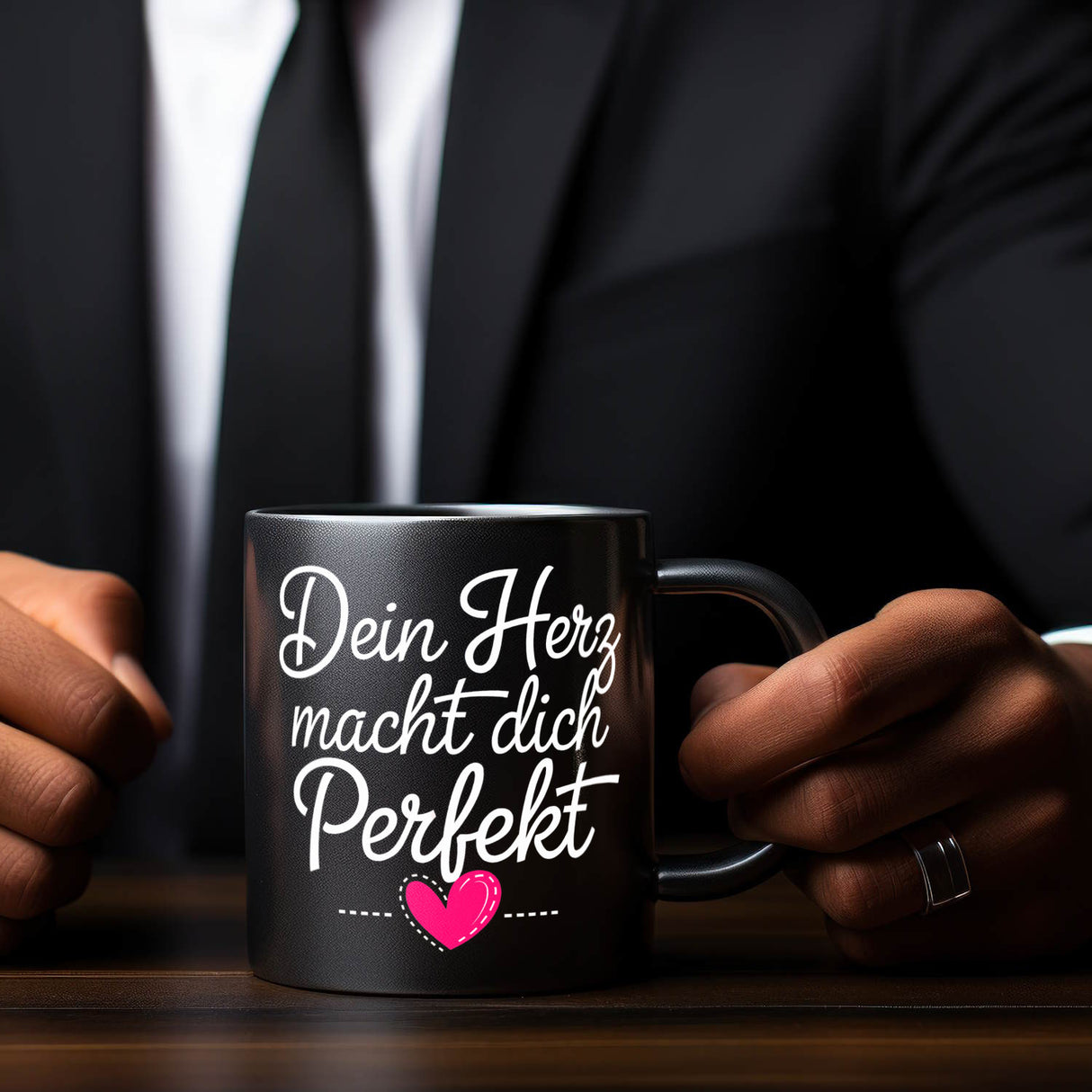 - Starte deinen Tag mit einem charmanten Gruß! Unser schwarzer Kaffeebecher gibt dir nicht nur deinen Koffein-Kick, sondern auch einen Herzschlag der guten Laune. Mit der eleganten deutschen Phrase "Dein Herz macht dich perfekt" in geschwungener Schrift wird jeder Schluck zu einem inspirierenden Erlebnis.