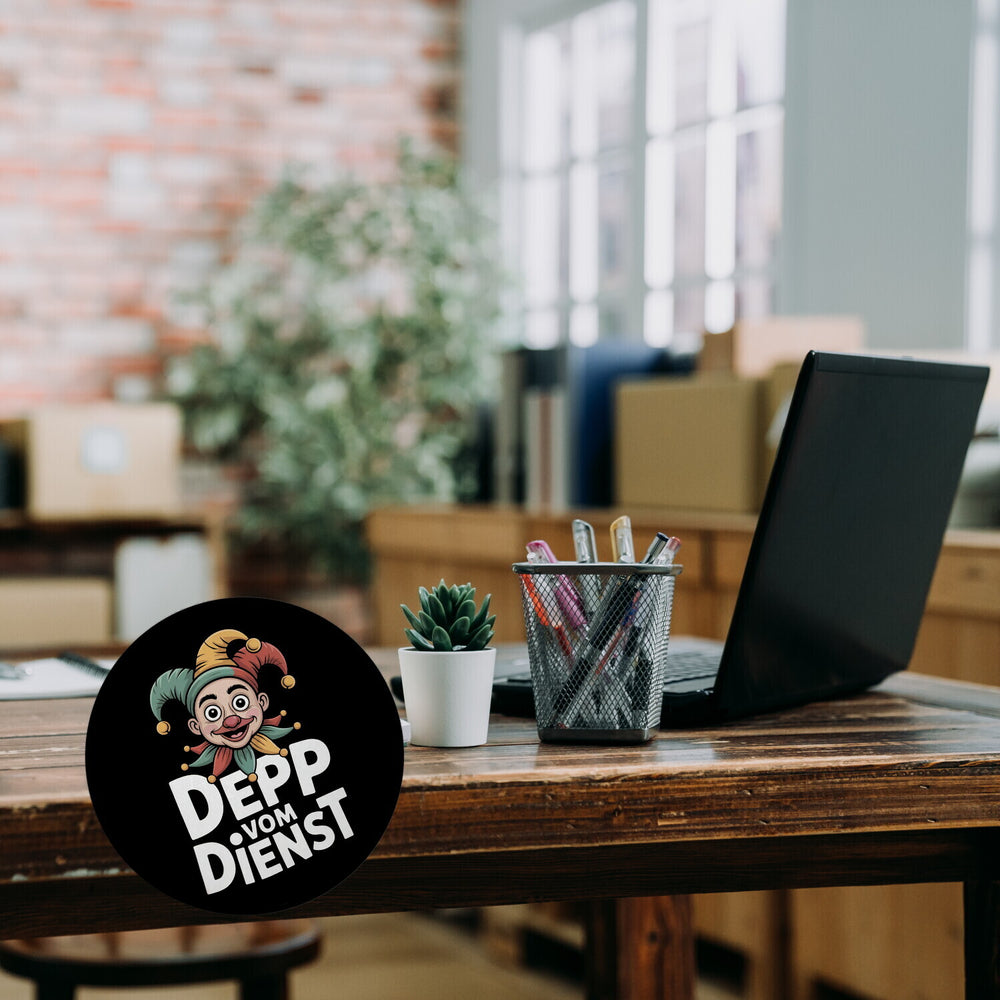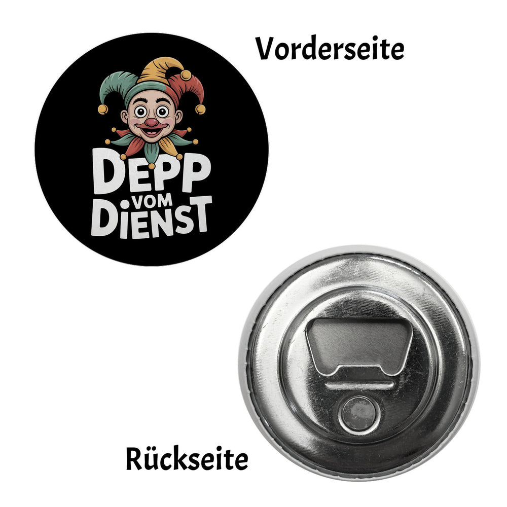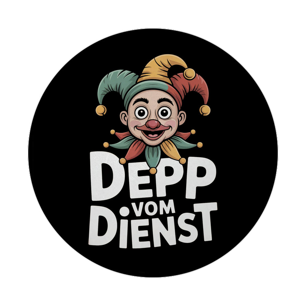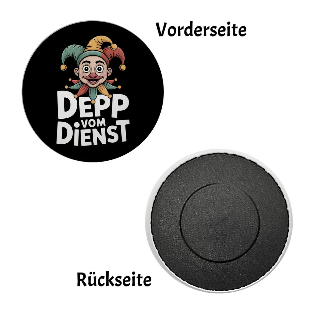 - Der "Depp vom Dienst" Magnet bringt Spaß an jeden Kühl- oder Aktenschrank. Mit einem bunten Kaspermotiv, das schelmisch grinst, und dem frechen Spruch zieht er alle Blicke auf sich. Das skurrile Cartoon-Design auf schwarzem Hintergrund verleiht ihm eine charmante und auffällige Erscheinung.