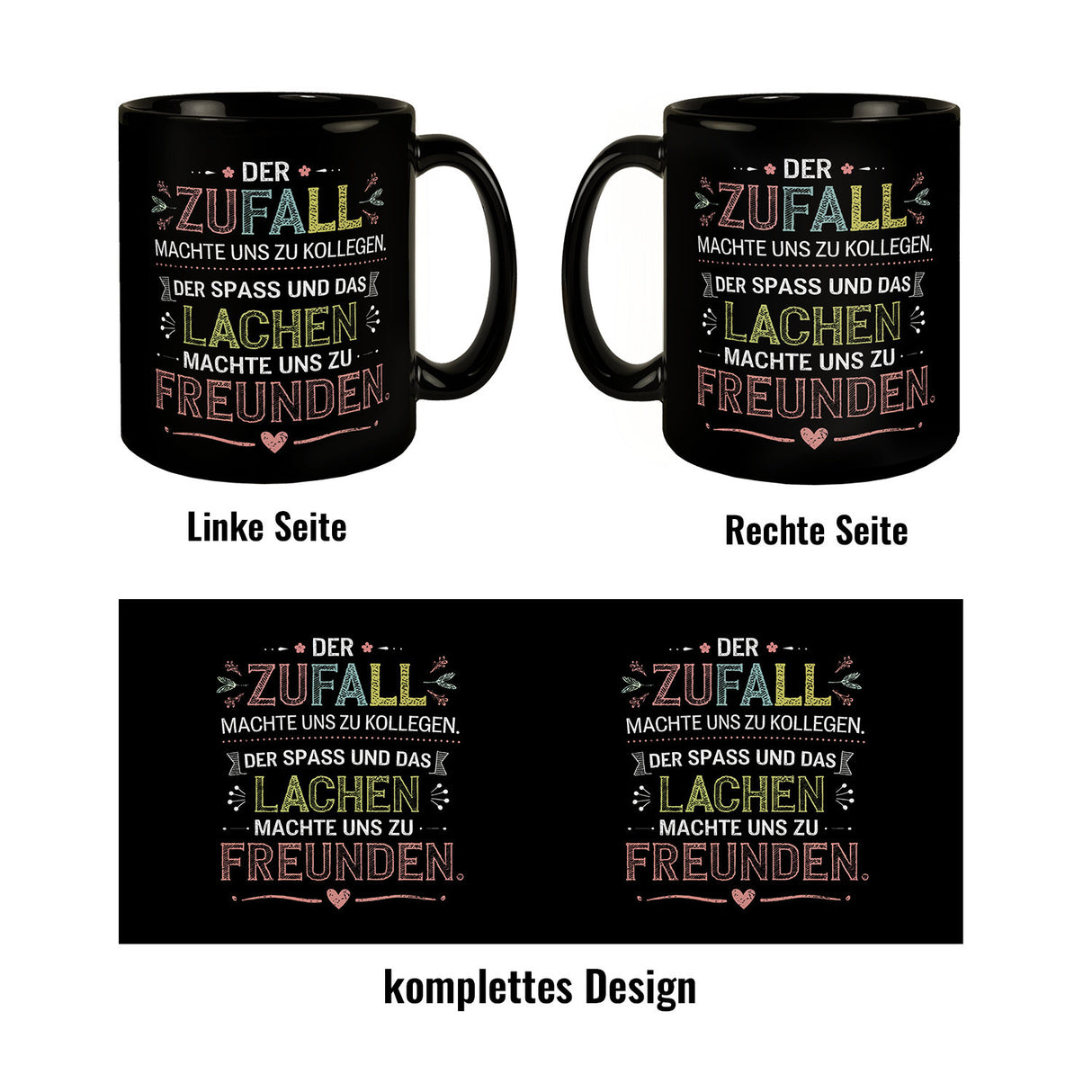 • Diese Tasse ist ein wahres Kunstwerk – mit variierenden Schriftarten und -größen hebt sich das Zitat „Der Zufall machte uns zu Kollegen. Der Spaß und das Lachen machte uns zu Freunden“ besonders hervor. Kleine Blumen und ein Herz runden das nostalgische Design ab. Ein echter Hingucker im femininen Stil!