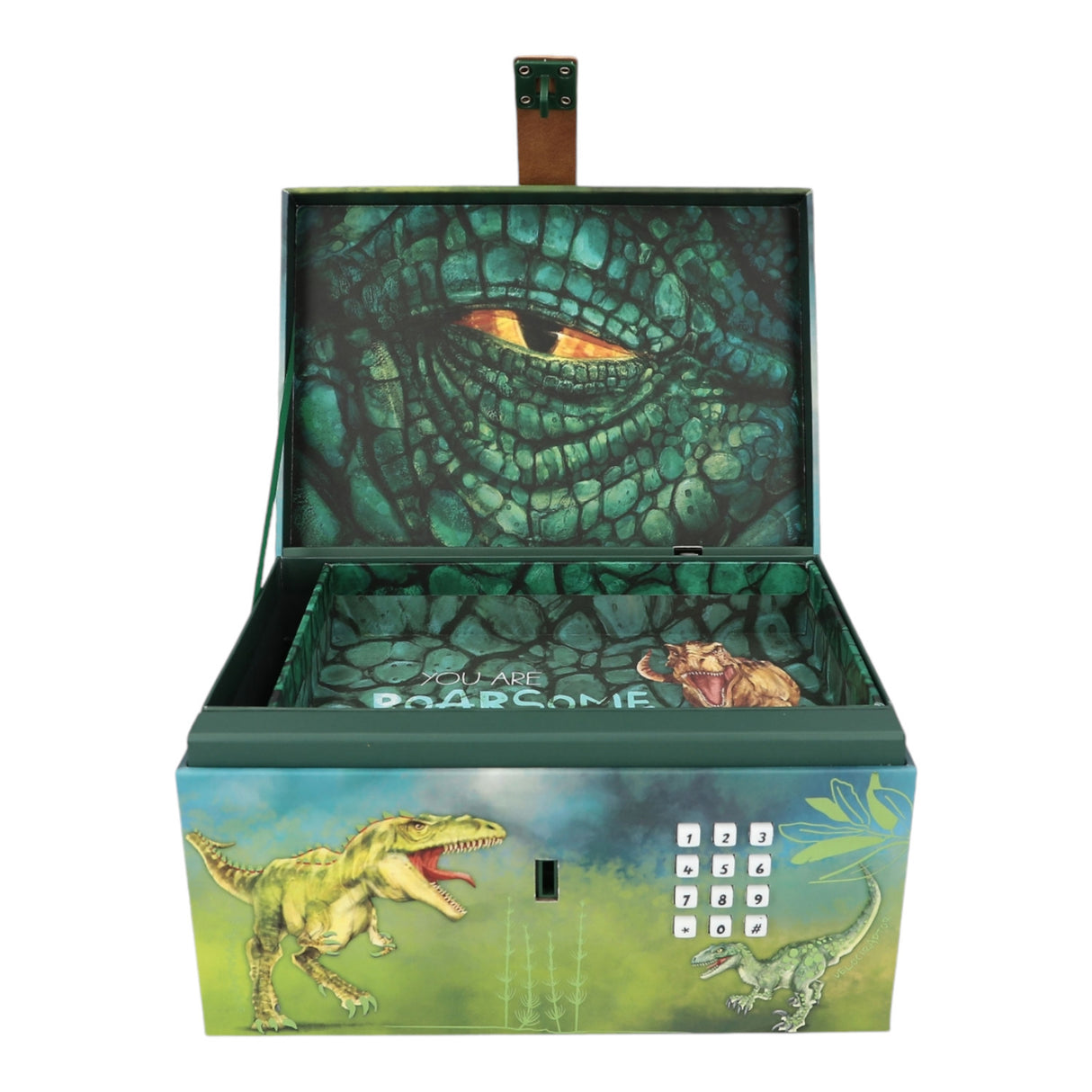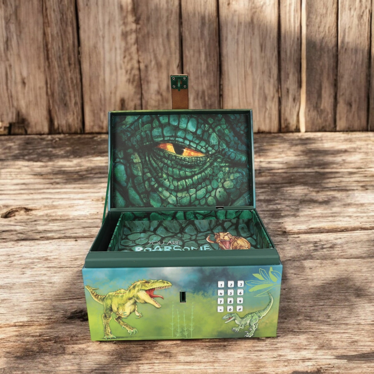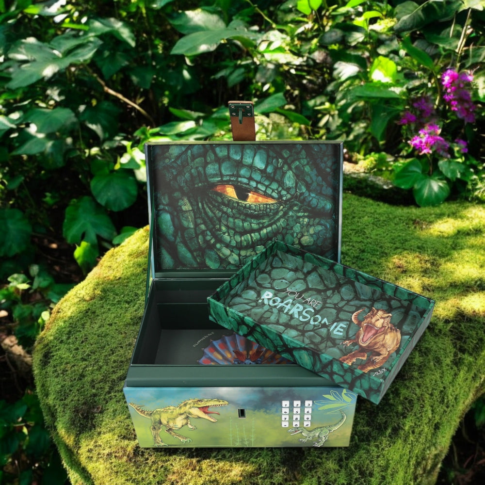 • Stellen Sie sich eine Schatztruhe vor, die sich nur mit einem geheimen vierstelligen Code öffnet! Bei der Eingabe ertönt ein cooles Dinosaurier-Gebrüll und ein feurig-rotes Dino-Auge leuchtet auf. Das Innere ist voller Dino-Motive und besitzt ein herausnehmbares Element, perfekt für geheime Fächer und versteckte Schätze.