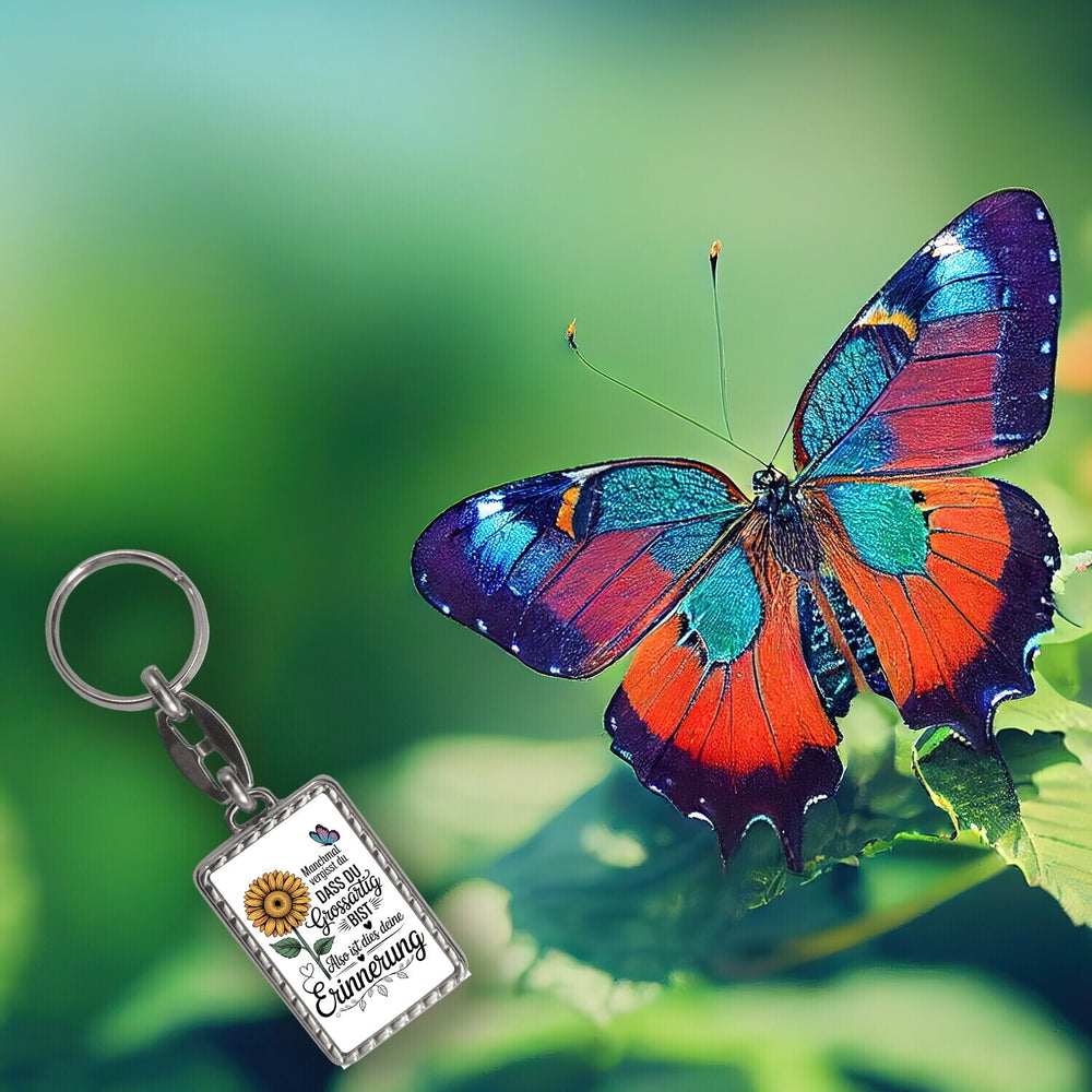 • Der Schlüsselanhänger besticht durch ein bezauberndes Sonnenblumen-Design, sorgfältig in lebhaften Gelb- und Orangetönen. Ein sanfter Schmetterling in Blau- und Lilatönen rundet das Motiv ab. Die dekorative Schrift mit dem motivierenden Spruch "Manchmal vergisst du, dass du großartig bist, also ist dies deine Erinnerung" verleiht dem Accessoire einen besonderen Charme.