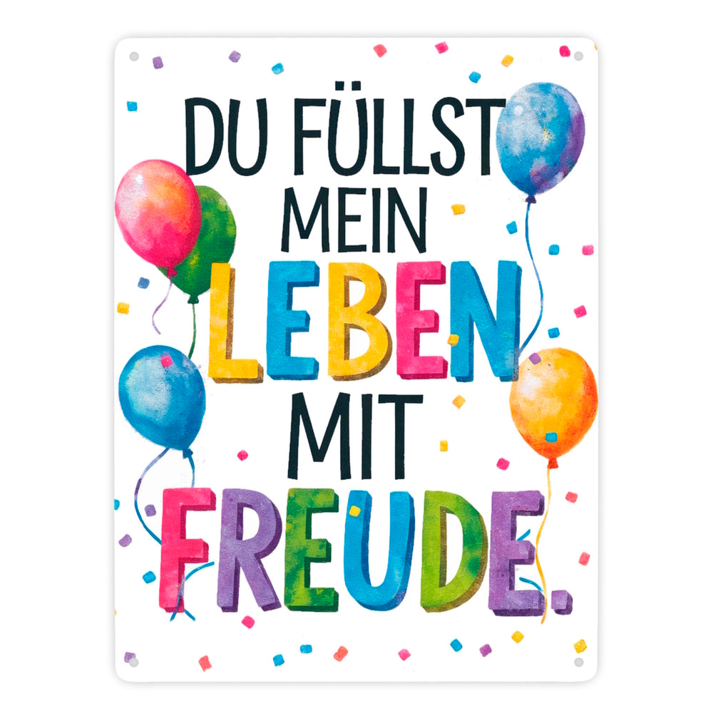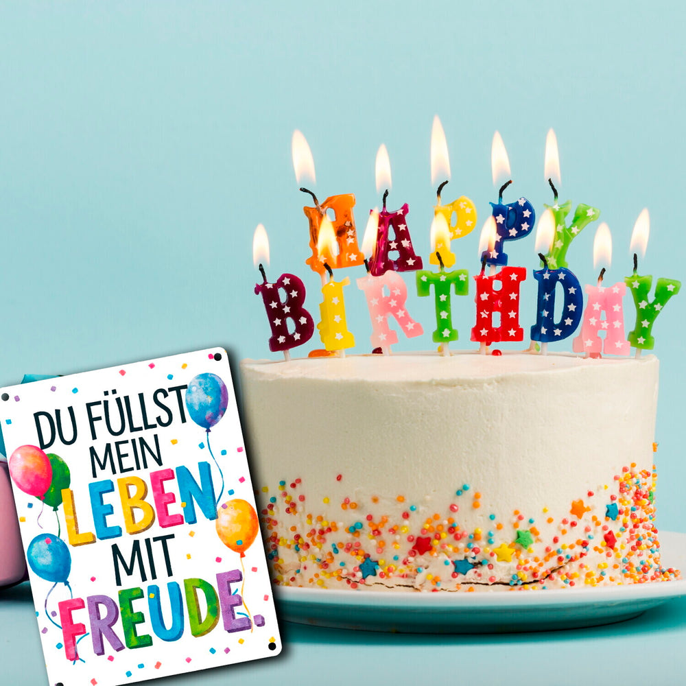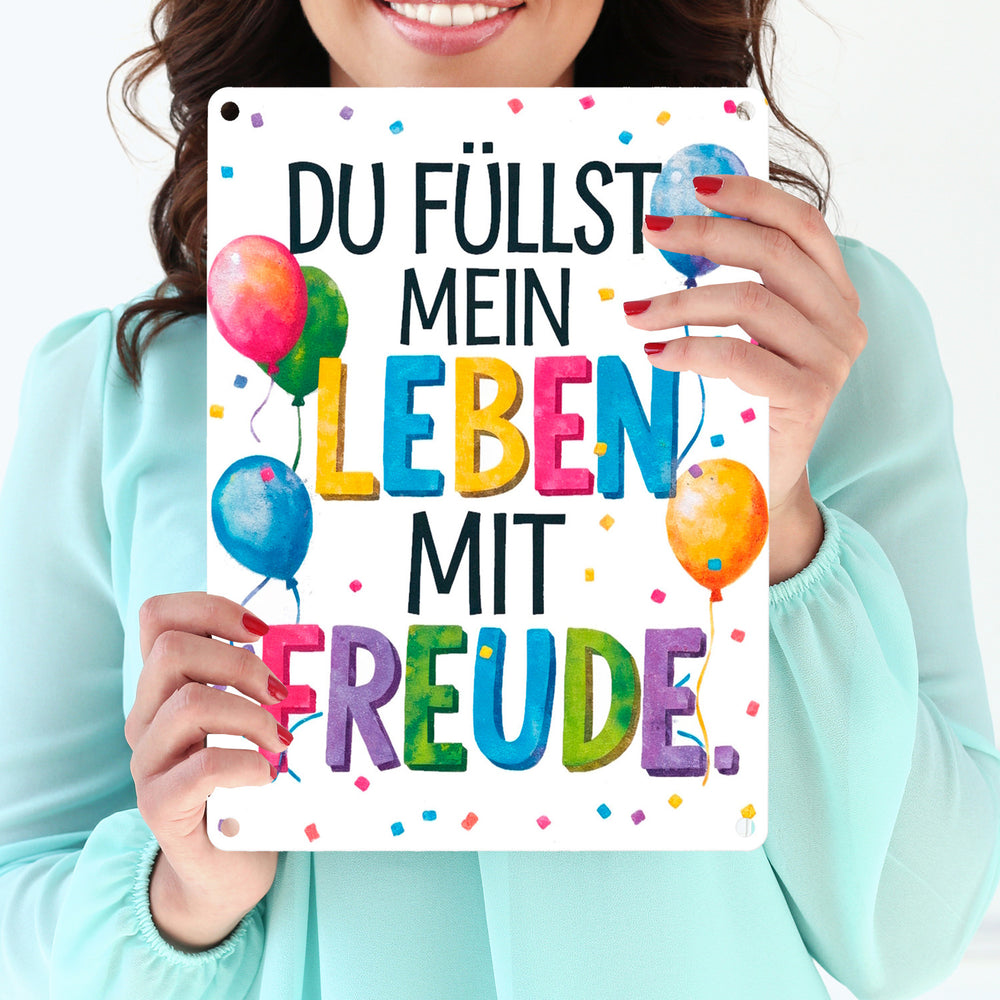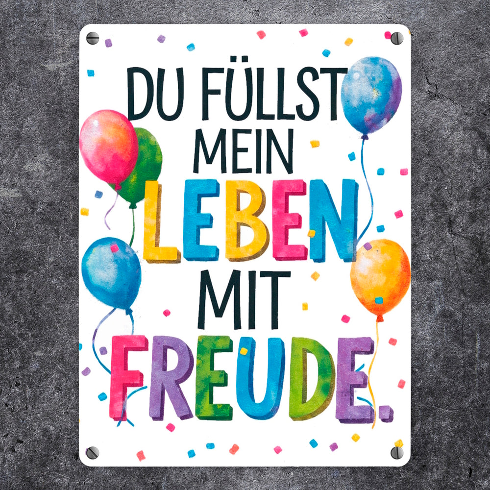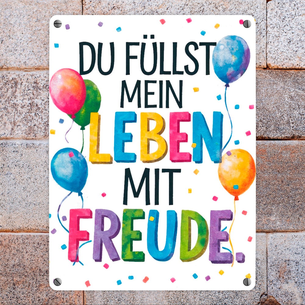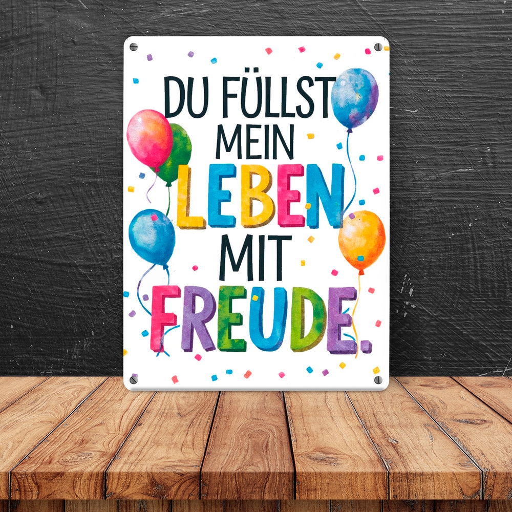 - Dieses farbenfrohe Metallschild bringt mit seinem verspielten Geburtstagsgrußdesign sofort gute Laune in jeden Raum! Auf einem weißen Hintergrund steht in großen, bunten Buchstaben: "DU FÜLLST MEIN LEBEN MIT FREUDE". Umgeben von fröhlichen Luftballons und Konfetti in Blau, Rot, Grün und Orange – ein echter Hingucker für fröhliche Anlässe!