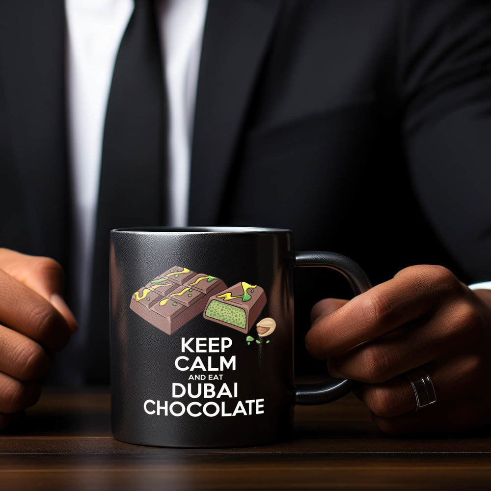 - Mit auffälligen gelben und grünen Verzierungen sticht die Schokoladentafel auf dem schwarzen Hintergrund hervor. Diese Tasse ist nicht nur für Schokofans, sondern auch für Anhänger des Social-Media-Trends ein Must-Have. Lass deinen inneren Schoko-Guru raus und genieße die warme Umarmung einer Kaffeetasse, die einfach "Keep Calm and eat Dubai Chocolate" sagt.