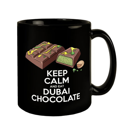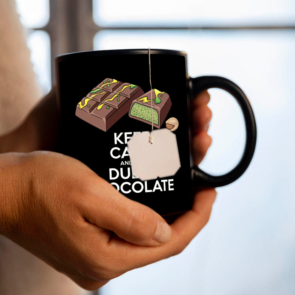 - Hast du mal an einem Montagmorgen versucht, keep calm zu bleiben? Wir haben die Lösung! Unsere schwarze Kaffeetasse mit der unwiderstehlichen Illustration von Dubai-Schokolade macht jeden Morgen zum Genuss. Die stilvolle Tasse zeigt eine verführerische Schokoladentafel – außen braun und innen grün gefüllt – und eine Pistazie.