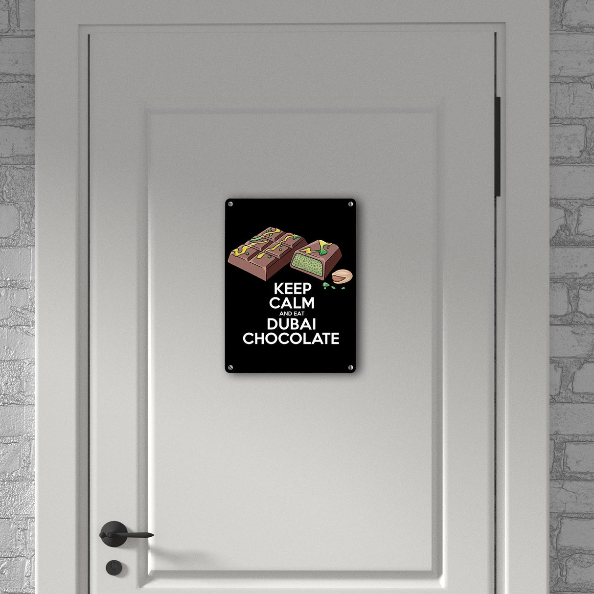 - Knackiges Metallschild gefällig? Dieses "Dubai Schokolade Metallschild" bringt das volle Dessert-Feeling in Dein Zuhause! Mit einem satten Schwarz, kombiniert mit der exotischen Illustration einer geteilten Dubai-Schokoladentafel und einer verlockenden Pistazie, bringt es den Geschmack von Abenteuer und Genuss an Deine Wand!