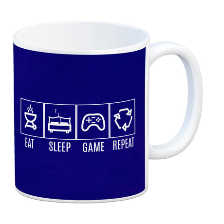 EAT, SLEEP, GAME, REPEAT Kaffeebecher mit blauem Hintergrund