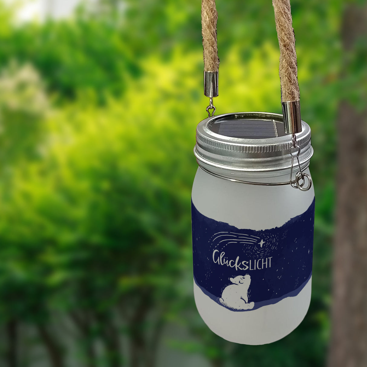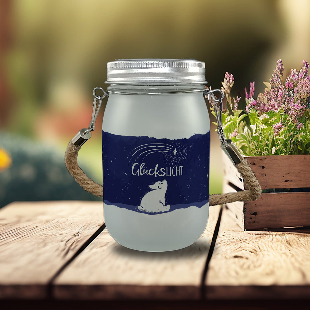 - Das Solarlicht mit Eisbär-Motiv ist ein echter Hingucker! Es zeigt einen niedlichen kleinen Eisbären, der eine Sternschnuppe sieht. Gestaltet wie ein Einmachglas mit Solar-Deckel und einem nostalgischen Strickhenkel, ist es perfekt für jeden, der ein Stück Winterzauber in seine Terrasse oder seinen Garten bringen möchte.
