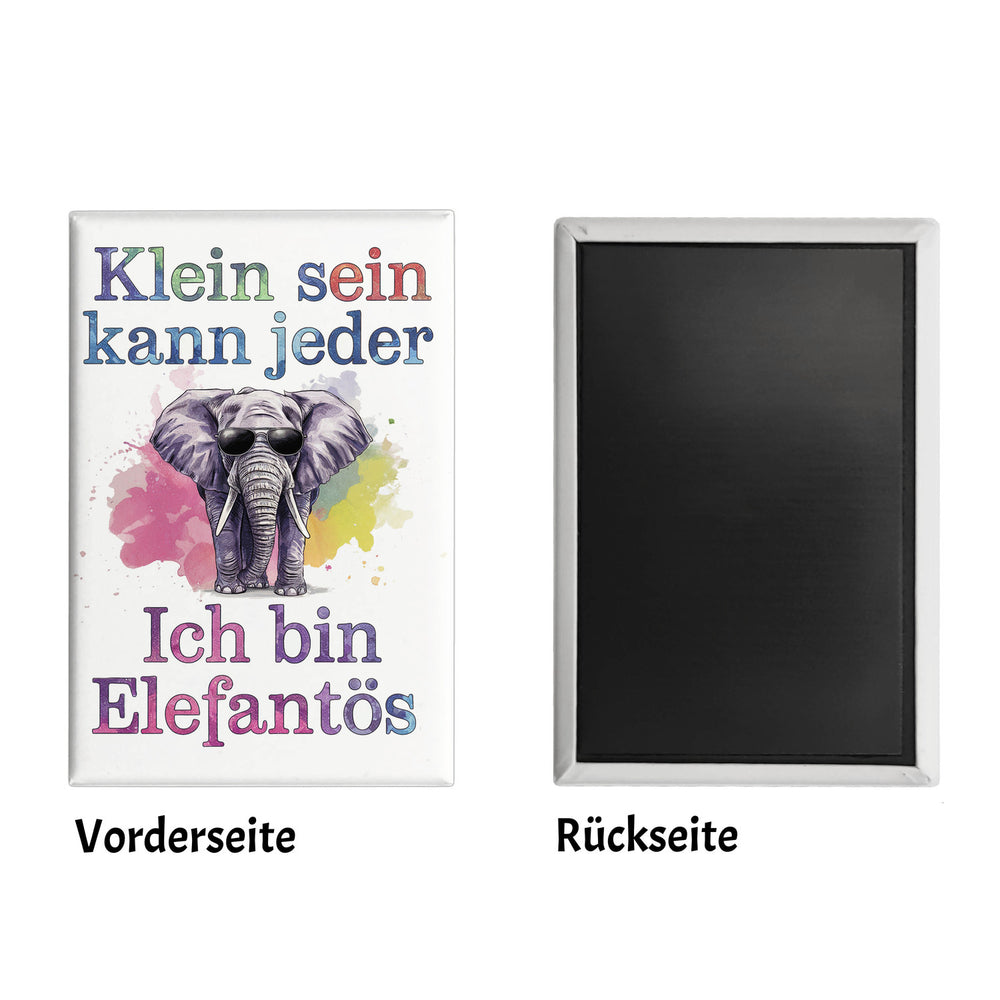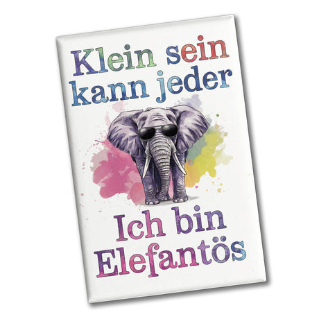 - Der Elefant mit Sonnenbrille Souvenir Magnet ist ein humorvoller Kühlschrankmagnet, der einen selbstbewussten Elefanten mit trendiger Sonnenbrille zeigt. Der farbenfrohe Aquarellspritzer hinter ihm und kleinere Tiere, die bewundernd zu ihm aufschauen, runden das lebendige Design ab. Die lustige Botschaft "Klein sein kann jeder, ich bin elefantös" verleiht dem Magneten eine einzigartige Note.