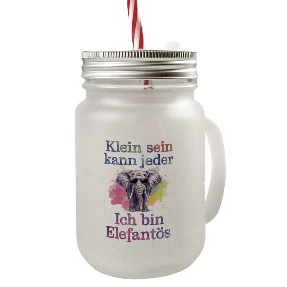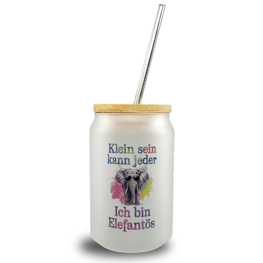 • Dieses Trinkglas ist ein echter Hingucker! Der Elefant mit Sonnenbrille strahlt Coolness und Selbstbewusstsein aus. Die Aquarell-Pastell-Illustration mit dem Spruch "Klein sein kann jeder, ich bin elefantös" zieht alle Blicke auf sich. Das bunte Design mit niedlichen Tieren sorgt für gute Laune und ist perfekt für Individualisten.