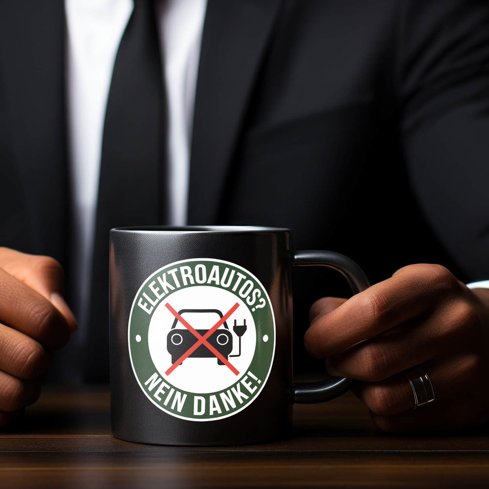 - Diese witzige Kaffeetasse ist schwarz und zeigt ein kraftvolles Motiv: Ein Auto mit Stecker, das durchgestrichen ist, und den markanten Spruch "ELEKTROAUTOS? NEIN DANKE!". Der grüne, kreisförmige Aufkleber hebt das humorvolle Statement hervor. Perfekt für alle, die ihren Kaffee mit einer Prise Humor und einer klaren Meinung genießen möchten.