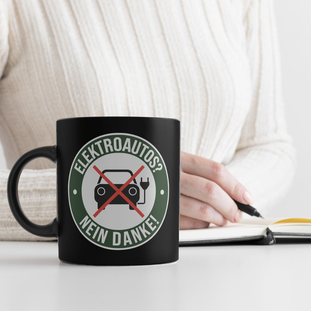 Diese witzige Kaffeetasse ist schwarz und zeigt ein kraftvolles Motiv: Ein Auto mit Stecker, das durchgestrichen ist, und den markanten Spruch "ELEKTROAUTOS? NEIN DANKE!". Der grüne, kreisförmige Aufkleber hebt das humorvolle Statement hervor. Per Hinweise: Fassungsvermögen: ca. 300ml