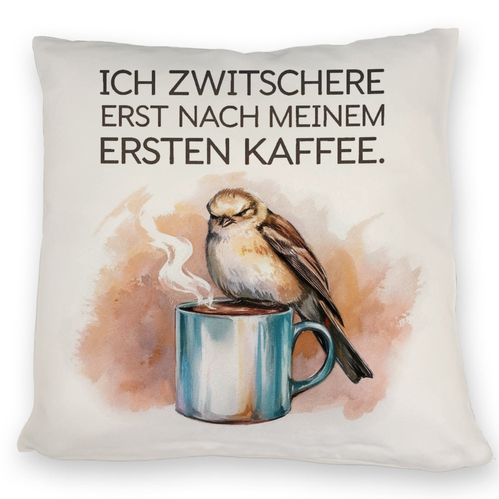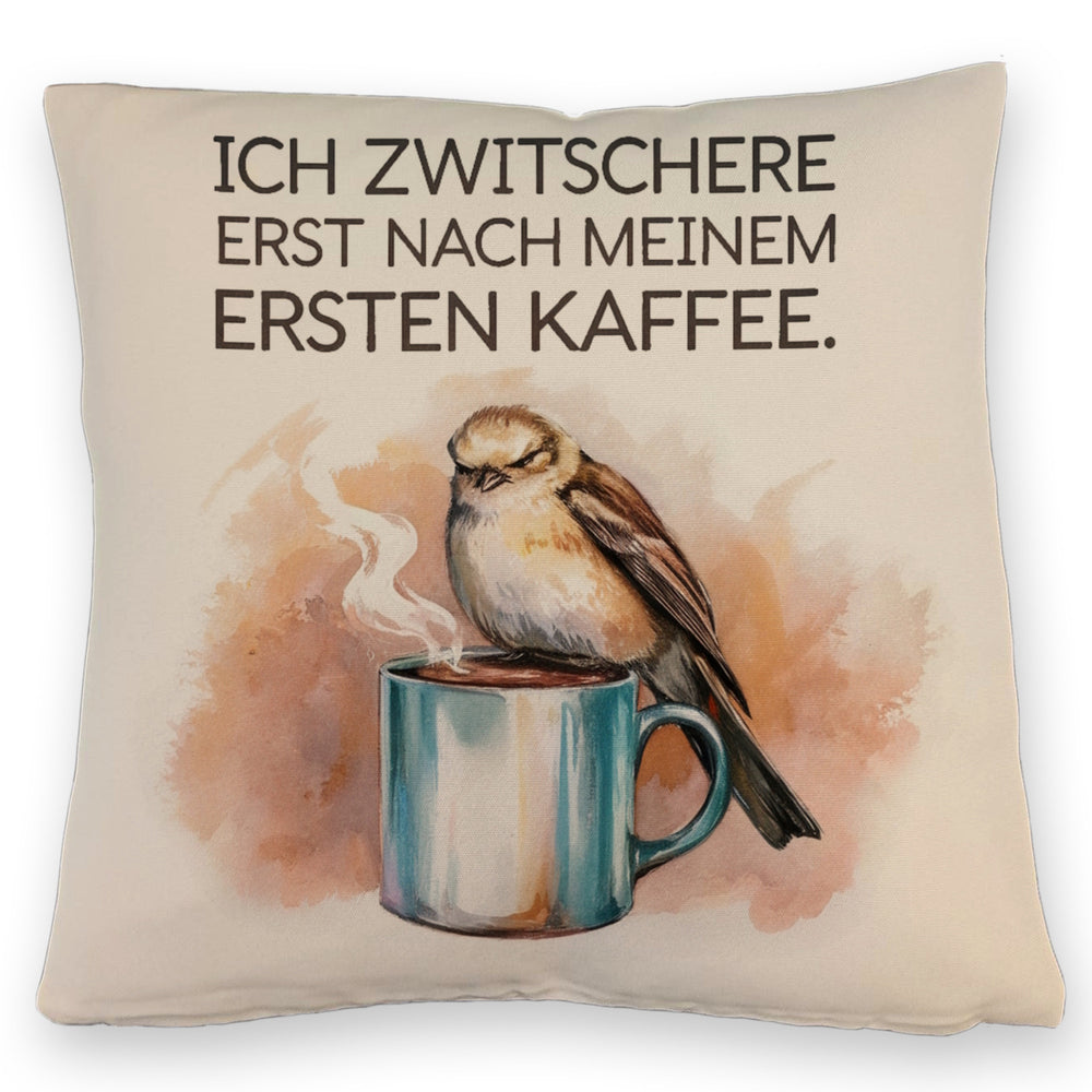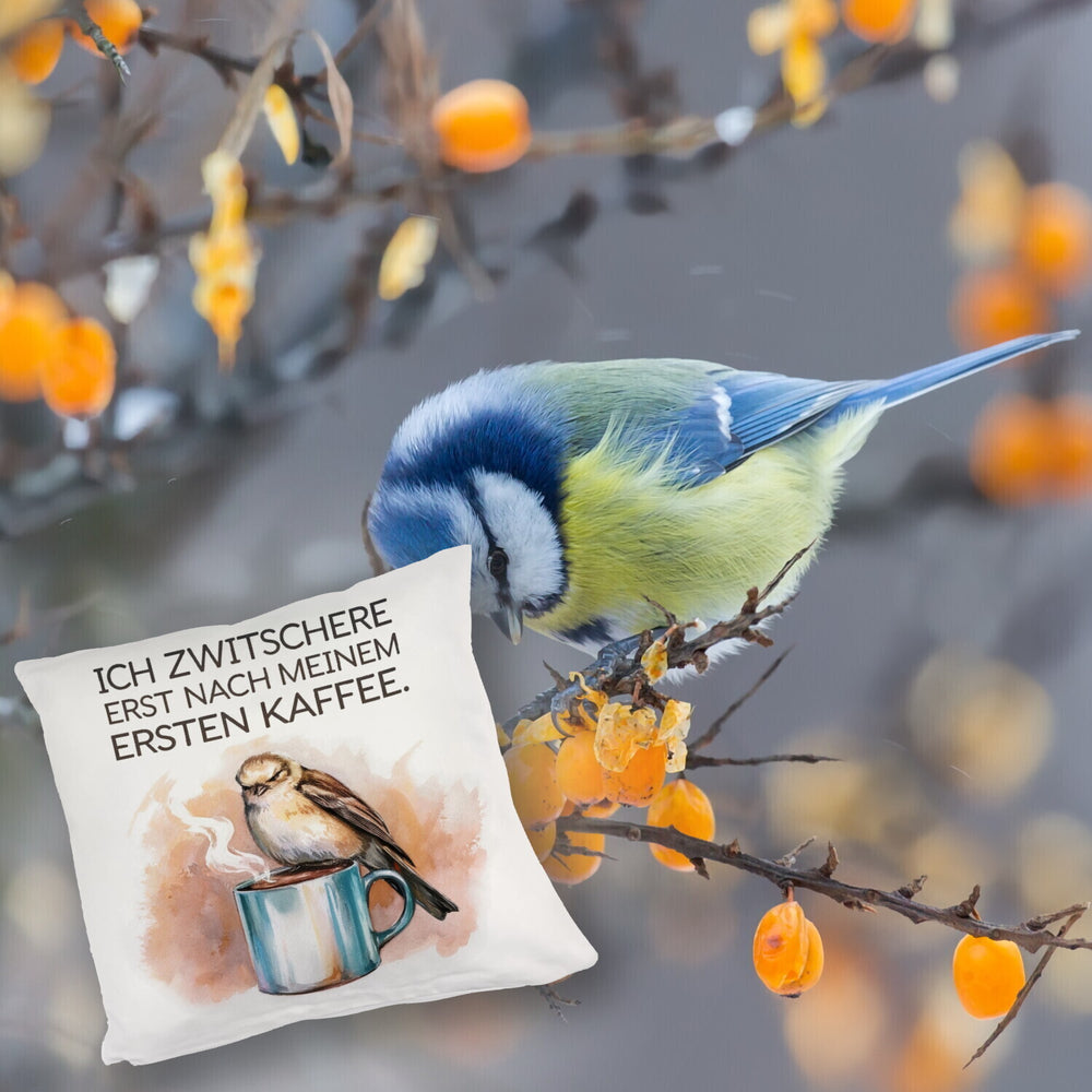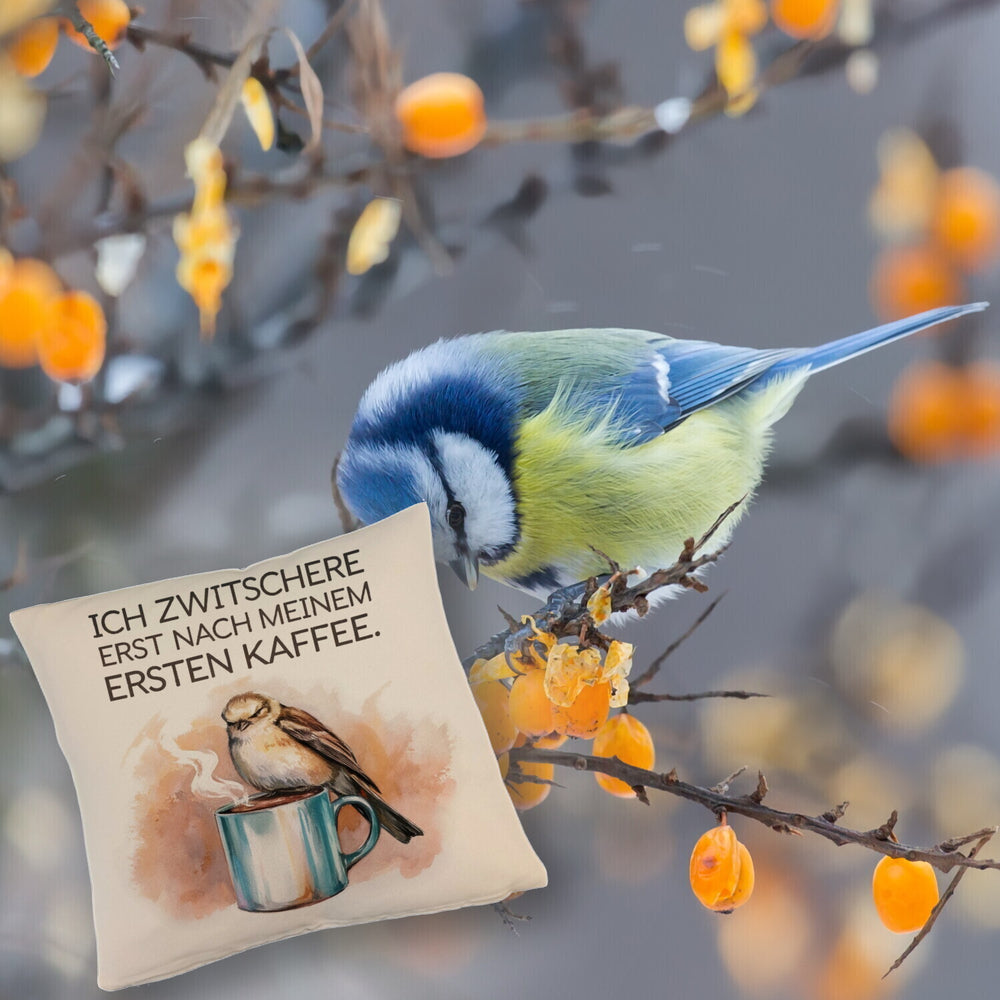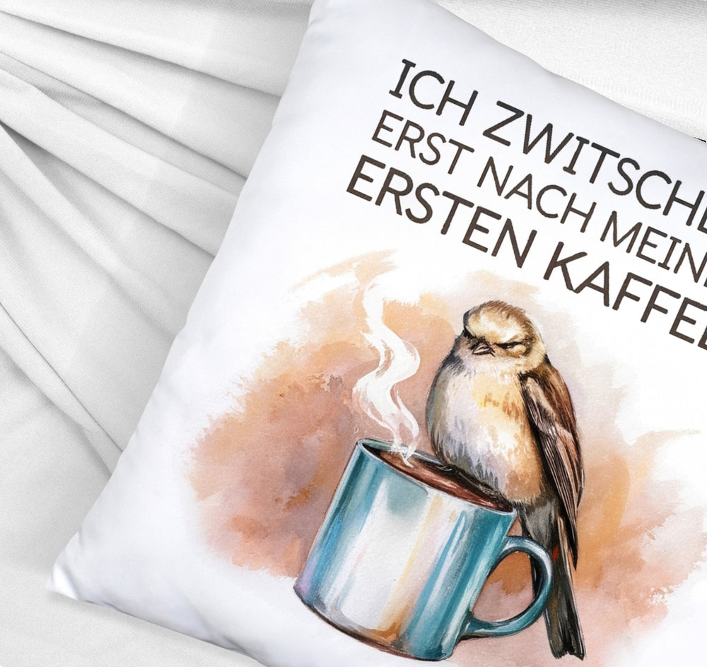 • 1x Erst Kaffee, dann Zwitschern Kissen mit Vogel auf Kaffeetasse in der gewählten Ausführung