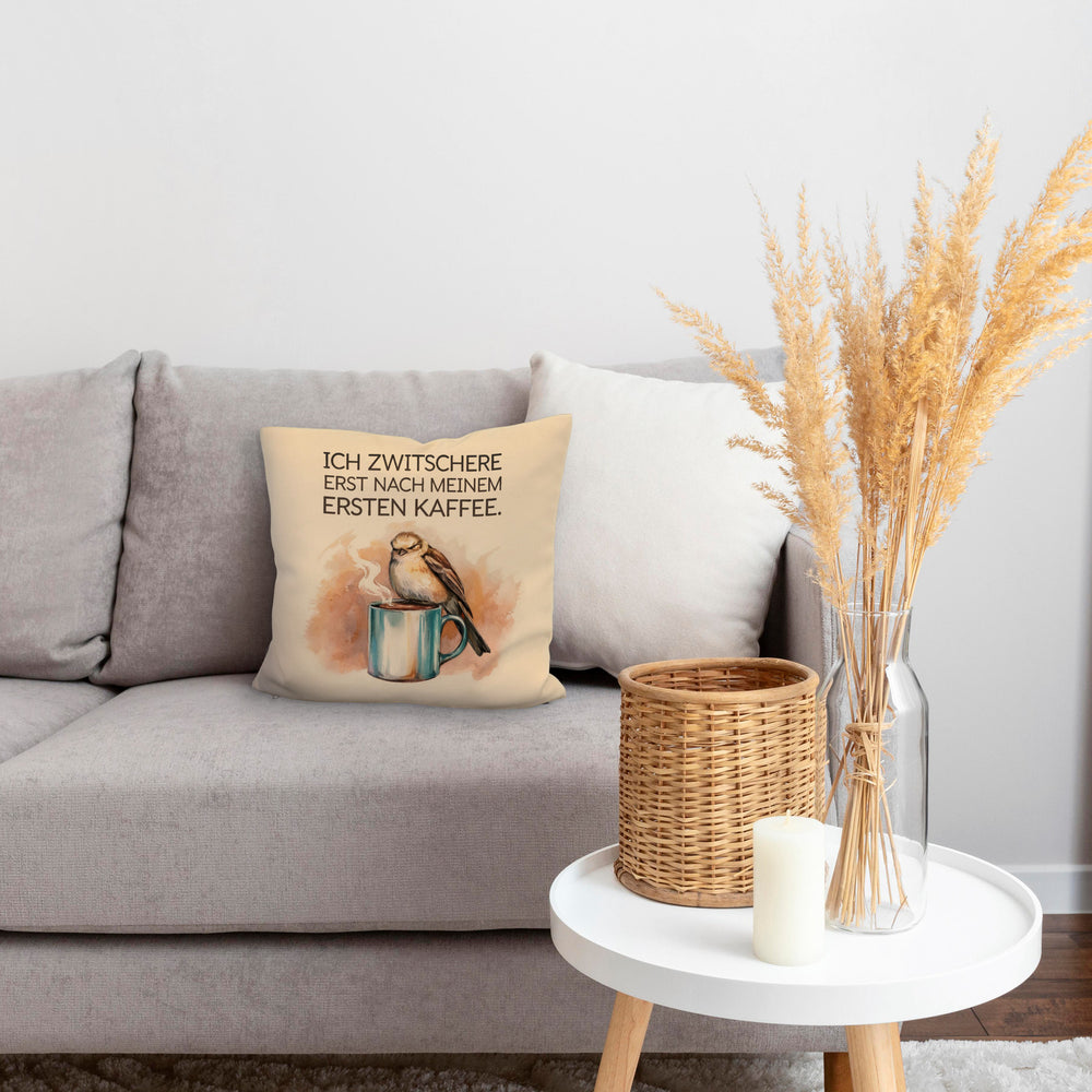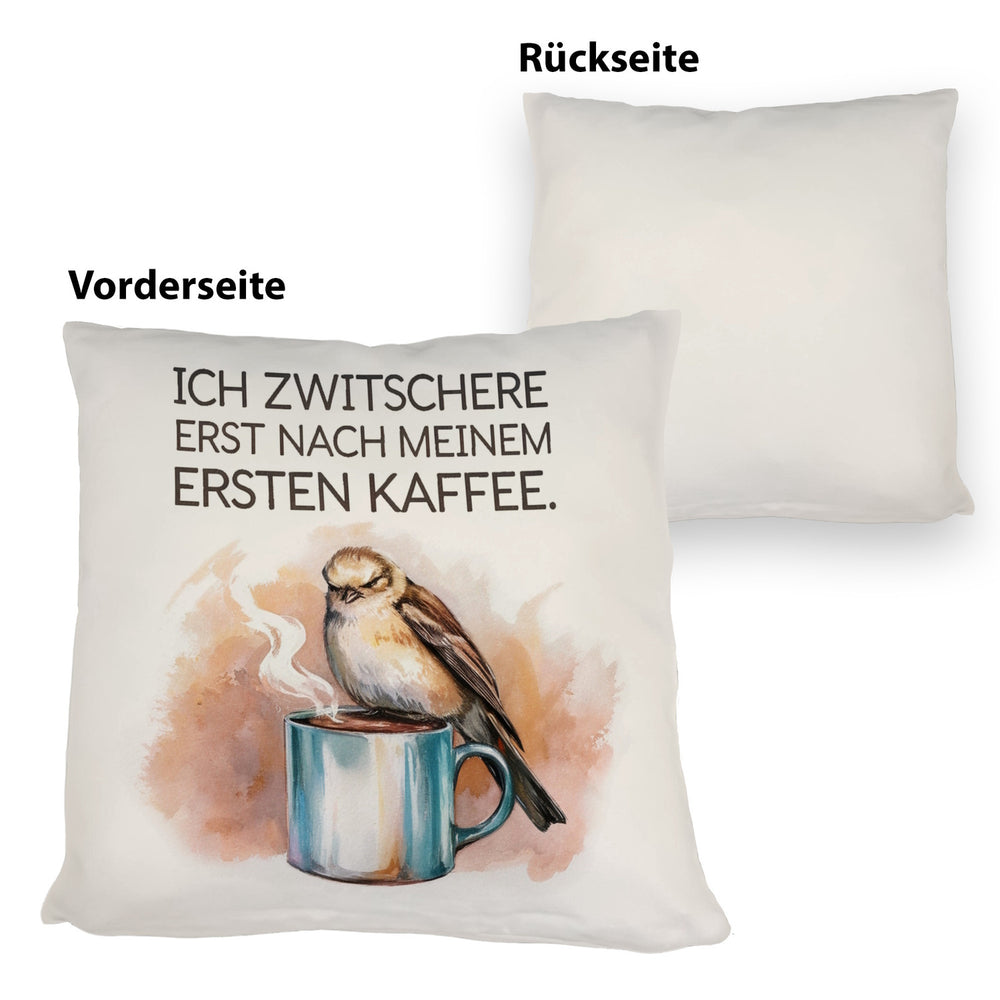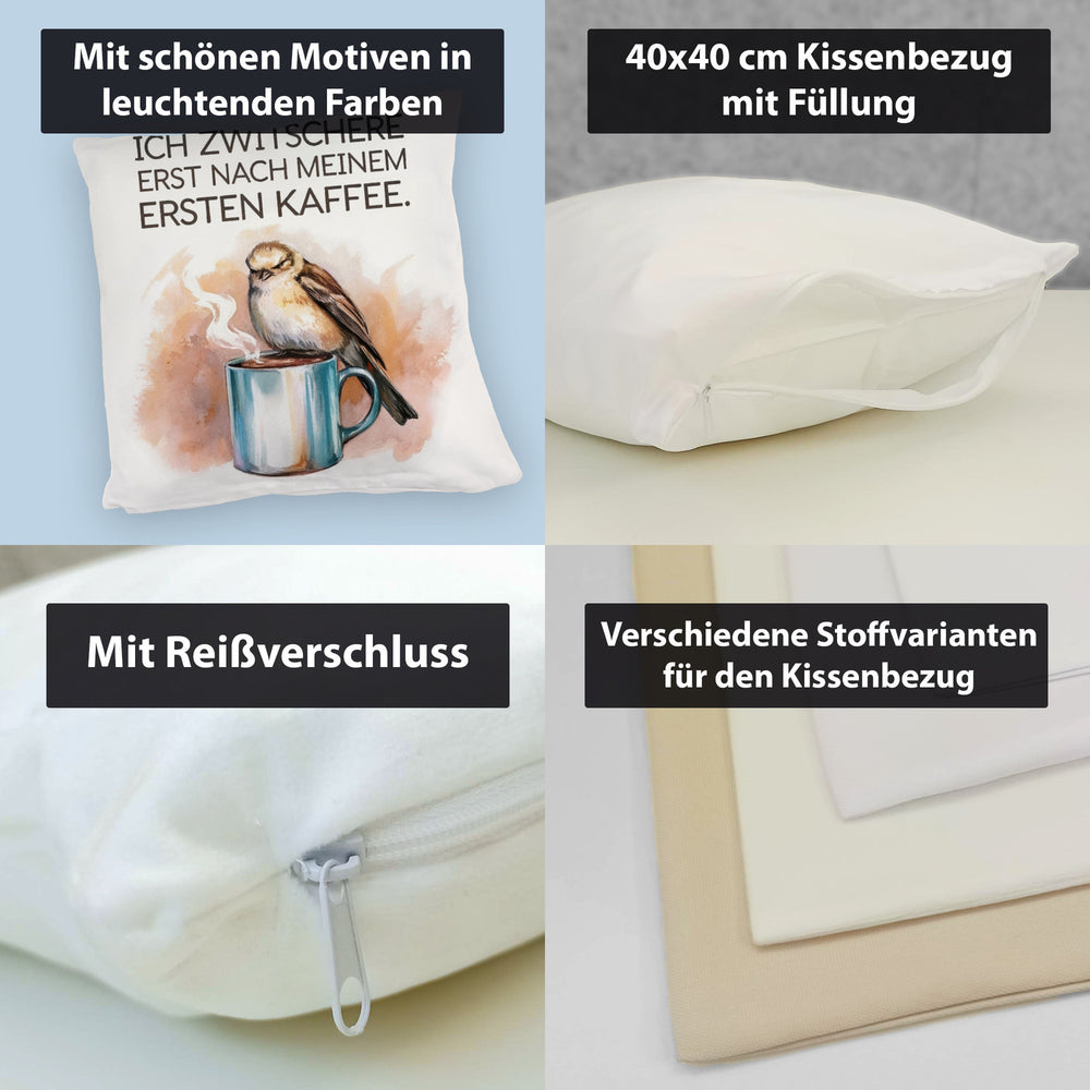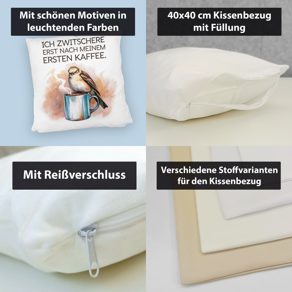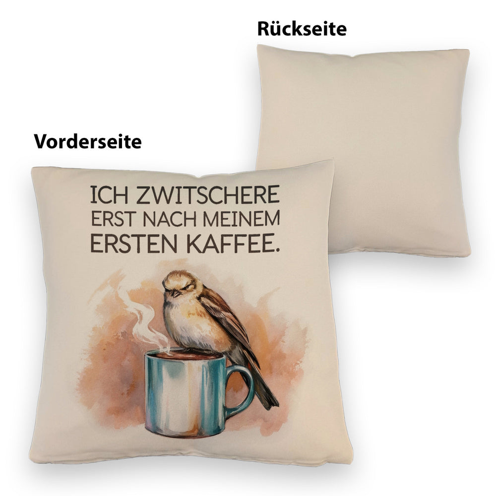 • 1x Erst Kaffee, dann Zwitschern Kissen mit Vogel auf Kaffeetasse in der gewählten Ausführung