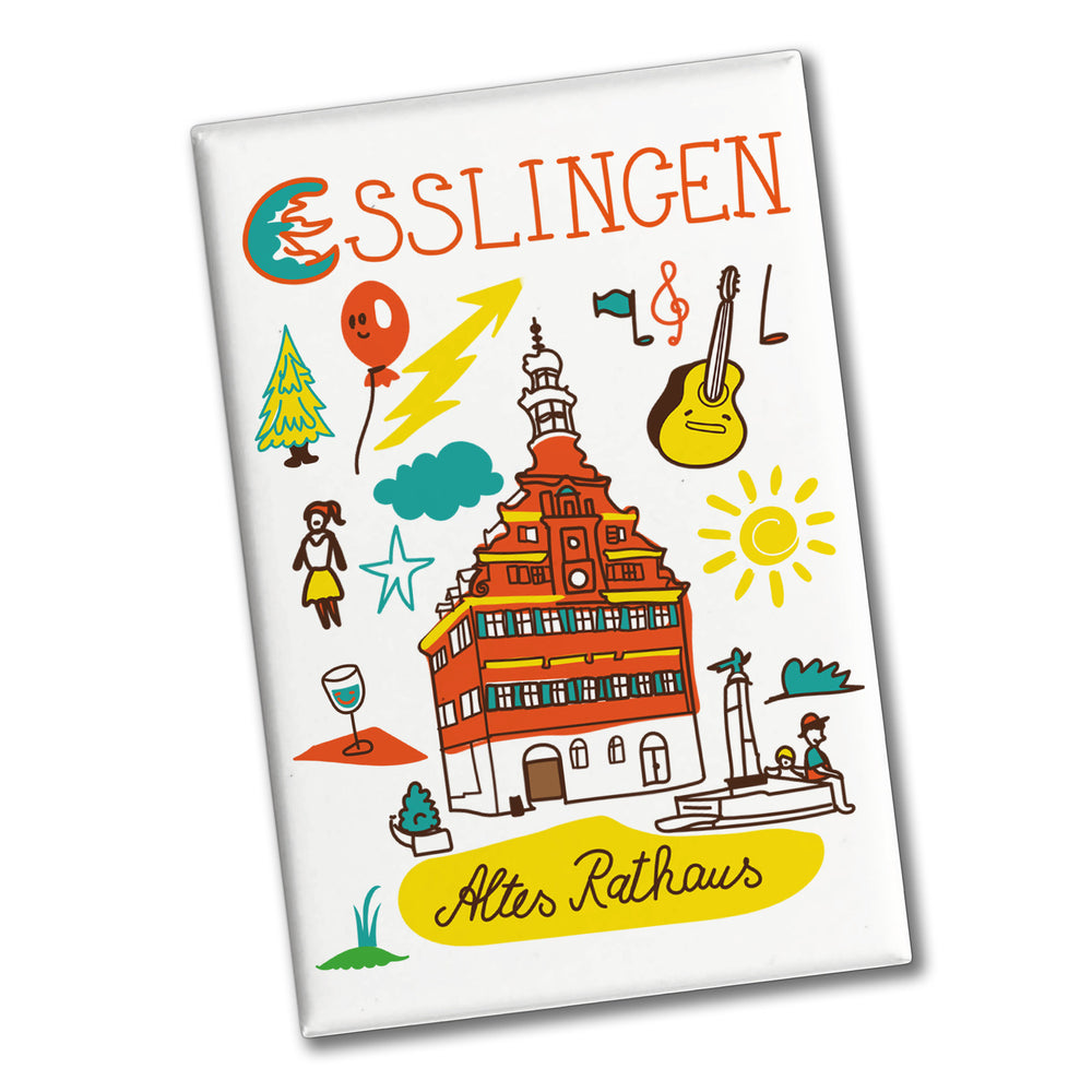 - Der Esslingen Wimmelbild Souvenir Magnet ist ein eckiges Dekomagnet, das die farbenfrohe Illustration der Stadt Esslingen zeigt. Im Mittelpunkt steht das beeindruckende 'Alte Rathaus', umgeben von verspielten Elementen wie einem Baum, einem Ballon und mehr. Die lebendige Farbpalette aus Rot, Gelb und Grün zieht sofort alle Blicke auf sich.