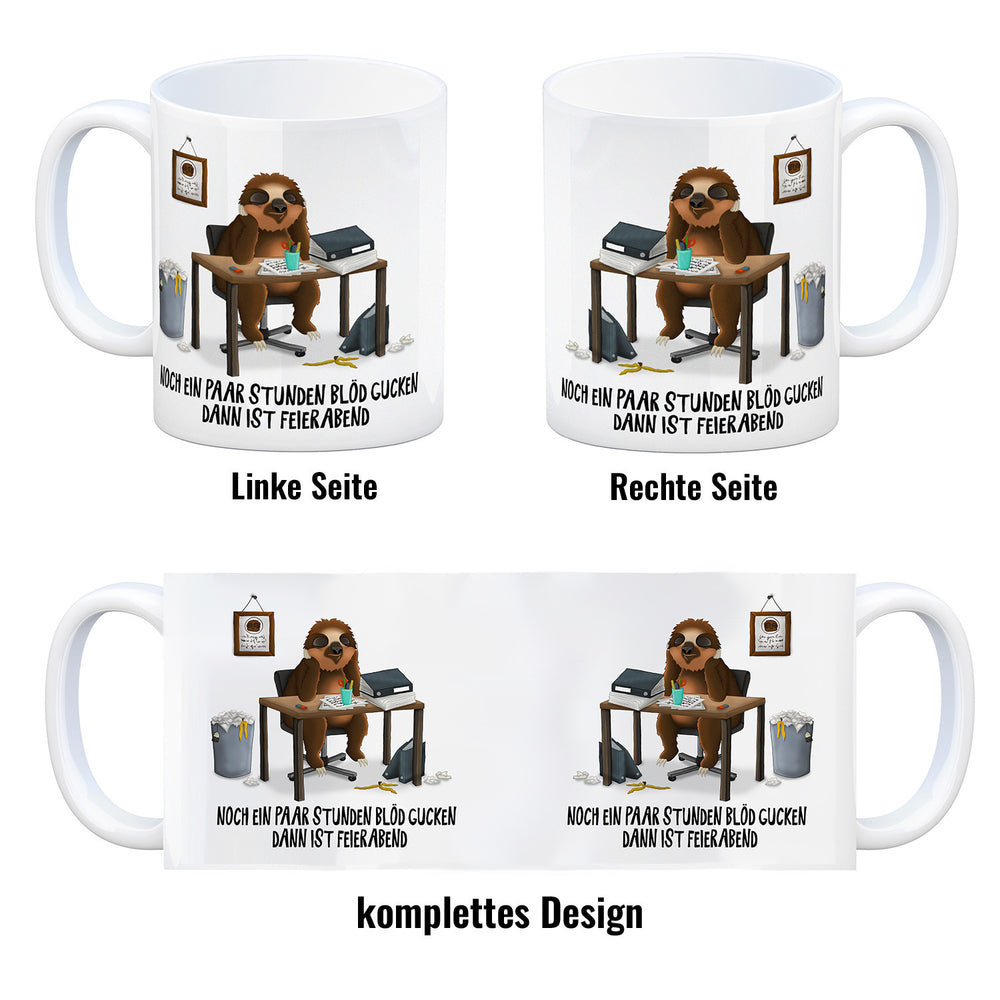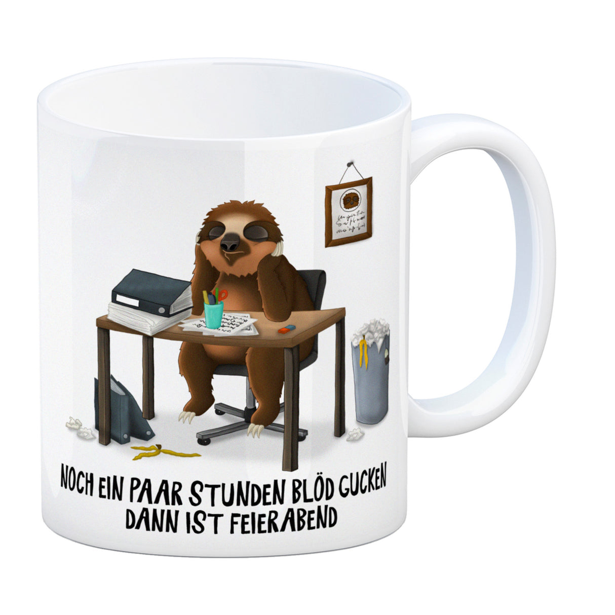 • Lieferumfang: 1x Kaffeebecher mit Faultier im Büro Motiv und Spruch: Nur noch ein paar Stunden blöd ...