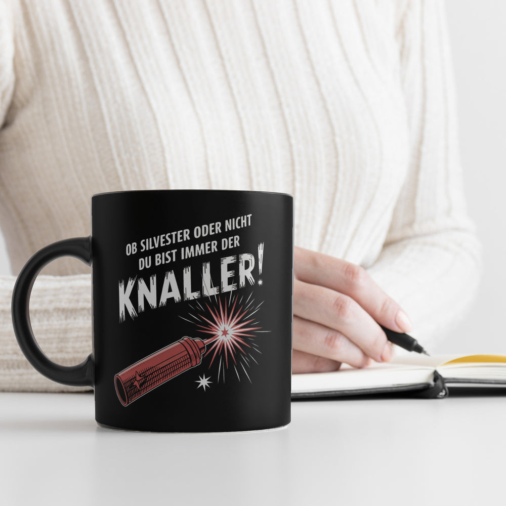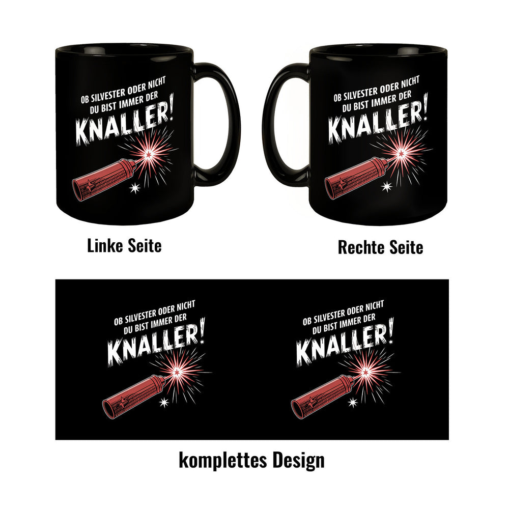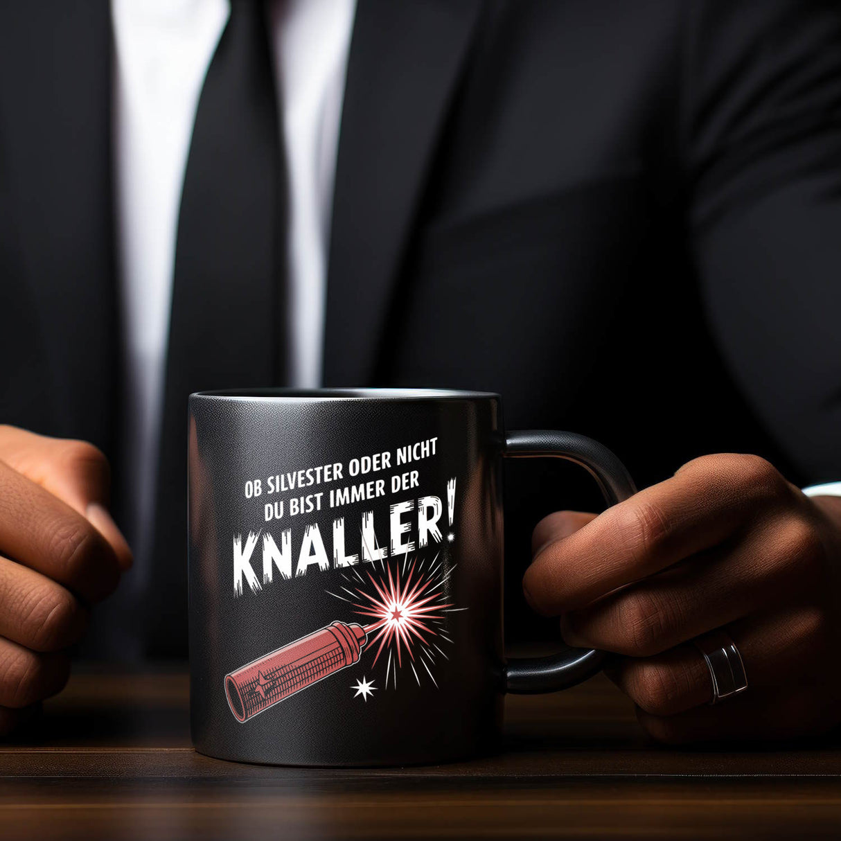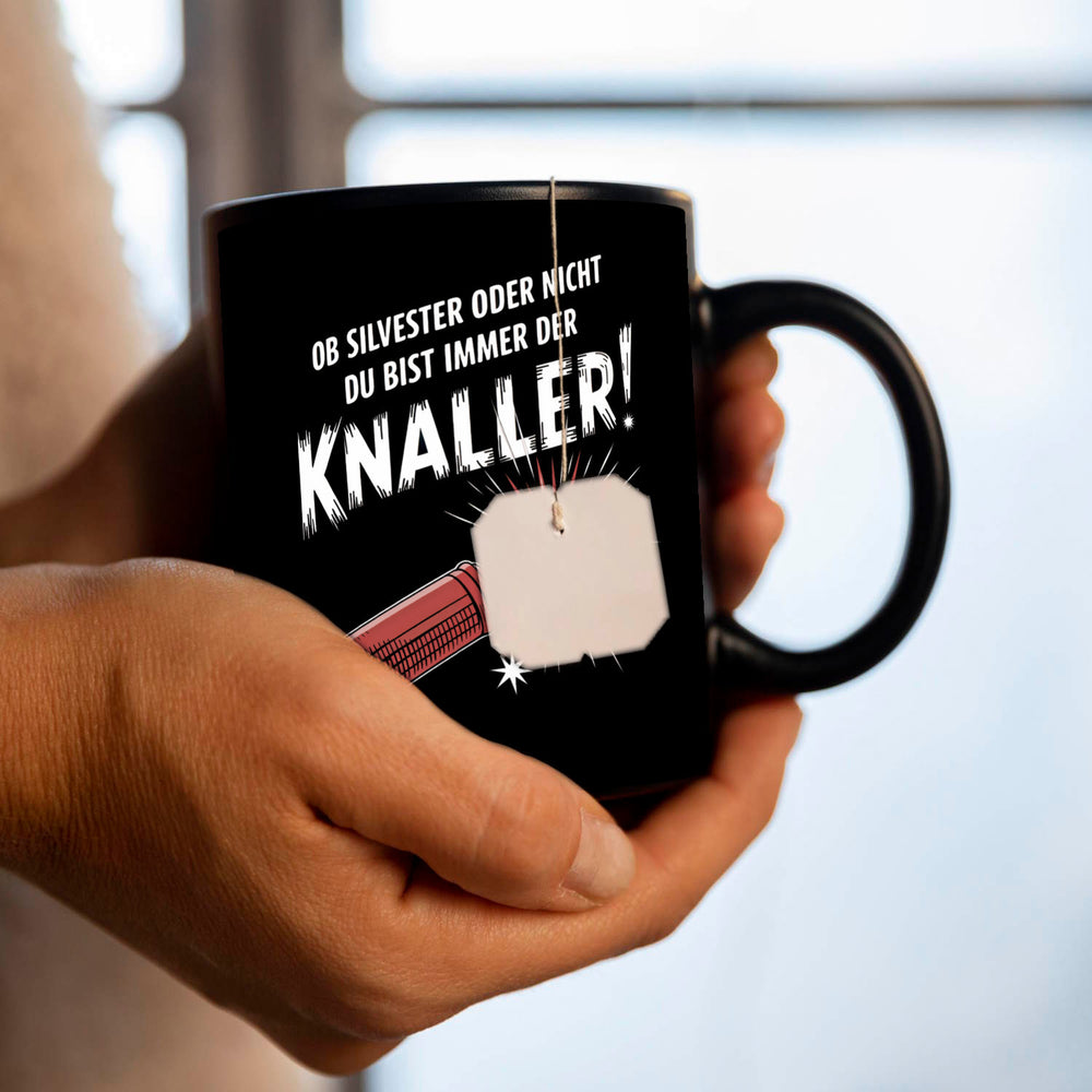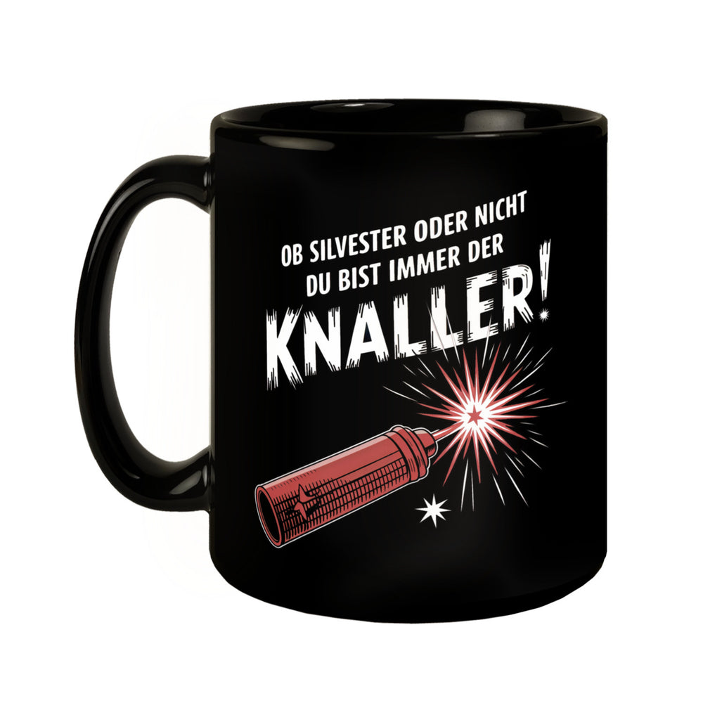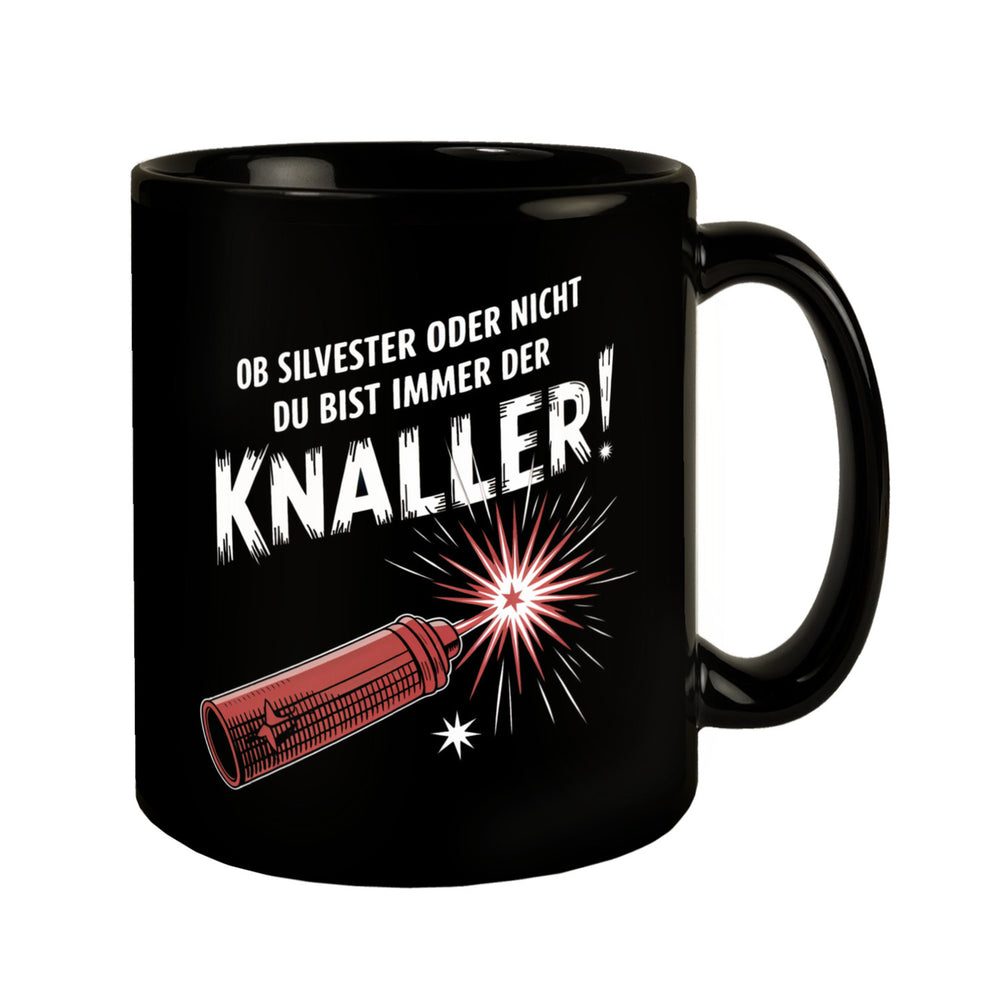 - Mit der Darstellung eines Feuerwerkskörpers und einer brennenden Zündschnur macht diese Tasse jedes Getränk zur spannenden Angelegenheit. Dazu der Spruch: „Ob Silvester oder nicht - du bist immer der Knaller!“ – das ideale Geschenk für Kaffeeliebhaber und Silvester-Junkies gleichermaßen. Mache jeden Schluck zu einem Ereignis!