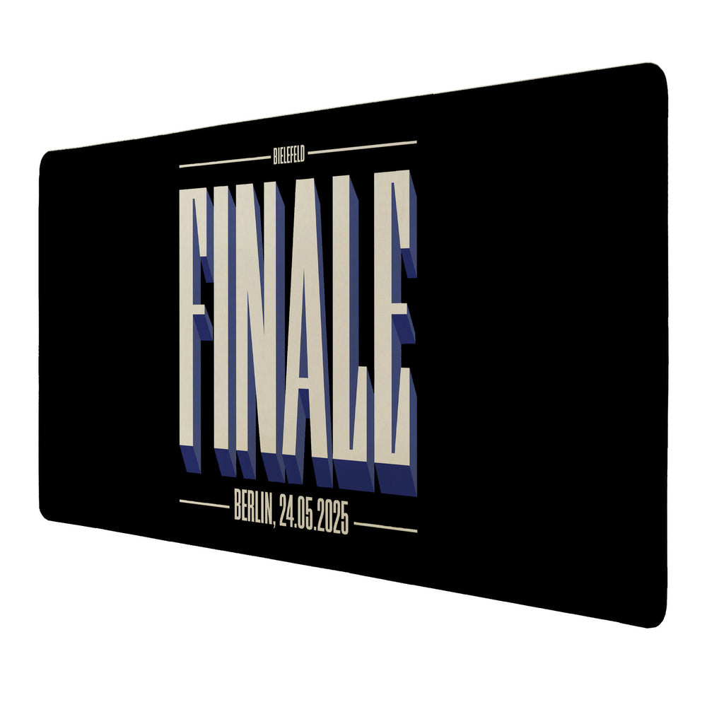 • Die Schreibtischunterlage präsentiert ein auffälliges Design mit dem Wort FINALE in großen, weißen Blockbuchstaben, verziert mit königsblauem Schatten. „Berlin, 24.05.2025“ prangt darunter, während „Bielefeld“ oben das Ganze perfekt abrundet. Der schwarze Hintergrund sorgt für den ultimativen Wow-Effekt. Ein Muss für stolze Ostwestfalen!