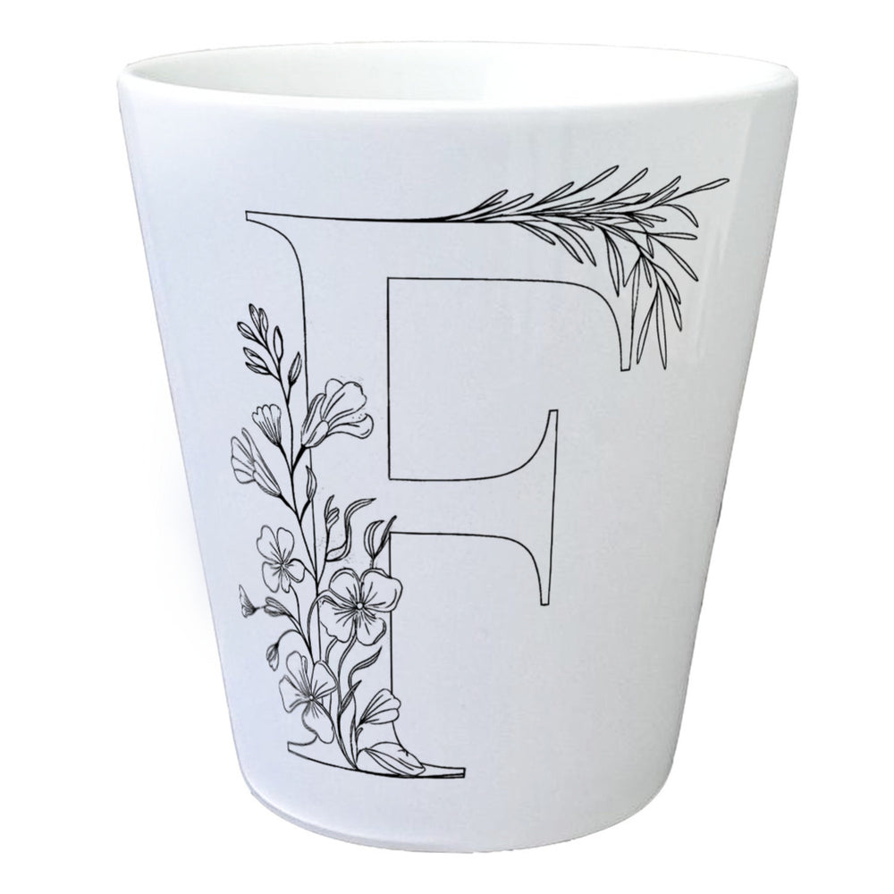 Der Floral Buchstabe F Blumentopf beeindruckt mit einem eleganten F-Design, umgeben von zarten Blumen und Blättern. Die aquarellartige Textur verleiht ihm eine künstlerische Note. Der weiße Hintergrund hebt die feinen Details hervor und macht diesen Blume Hinweise: Material: Keramik / Höhe: ca. 10 cm, Durchmesser oben: ca. 9cm / Mit Bodenloch zur Vermeidung von Staunässe.
