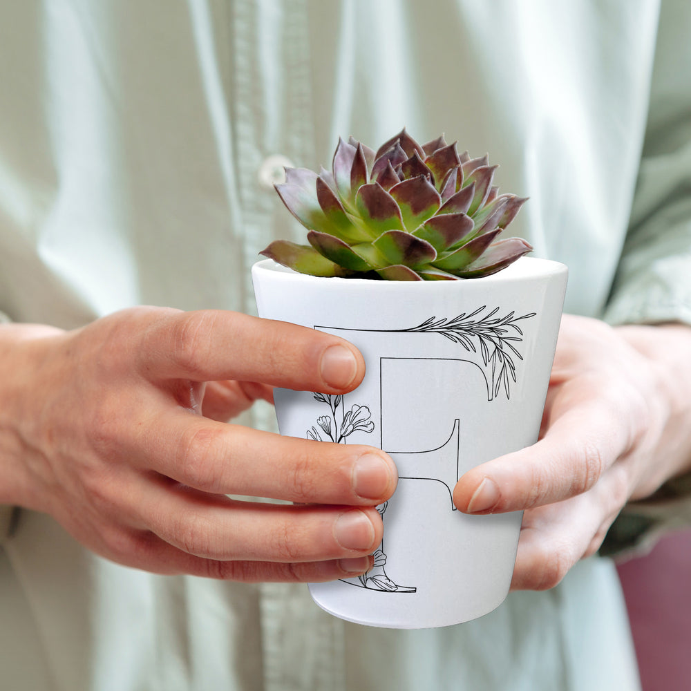 - Der Floral Buchstabe F Blumentopf beeindruckt mit einem eleganten F-Design, umgeben von zarten Blumen und Blättern. Die aquarellartige Textur verleiht ihm eine künstlerische Note. Der weiße Hintergrund hebt die feinen Details hervor und macht diesen Blumentopf zu einem stilvollen Hingucker in jedem Raum.