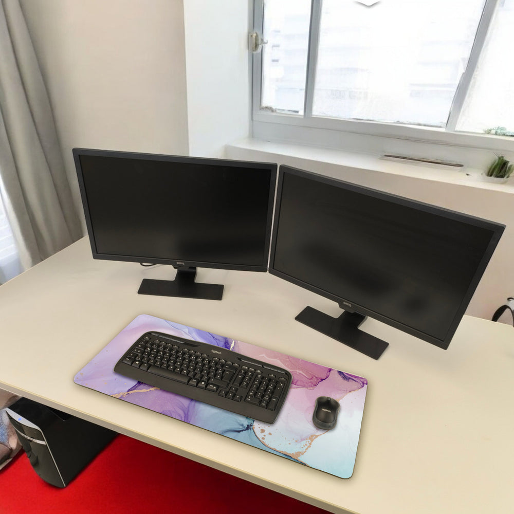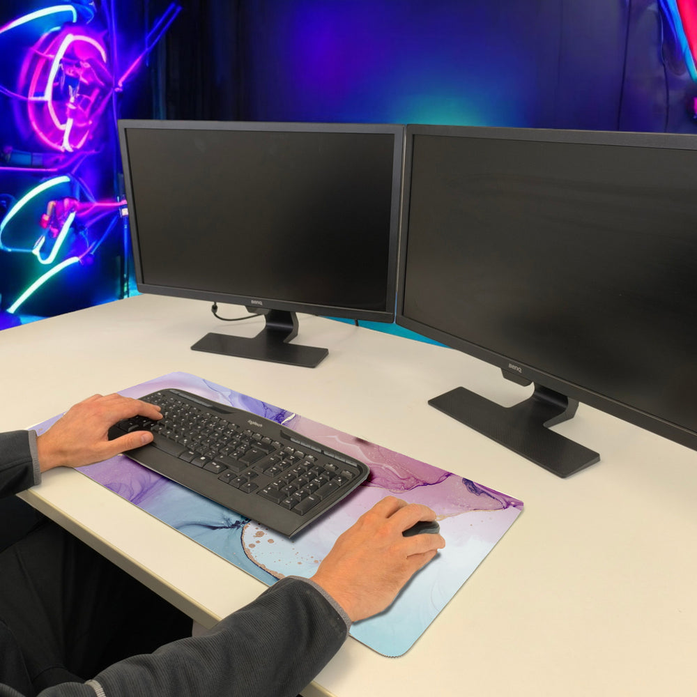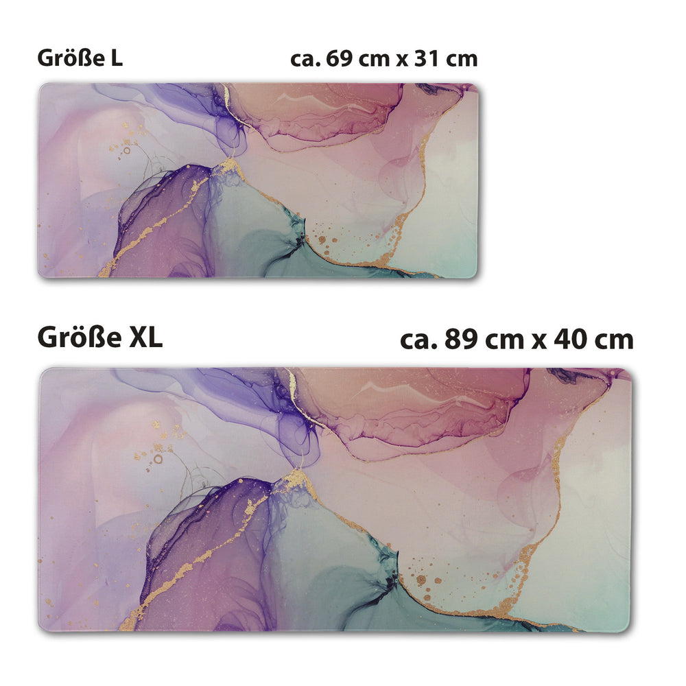 Verleihen Sie Ihrem Schreibtisch das Upgrade, das er verdient – mit unserer bezaubernden Fluid Art Wirbel Schreibtischunterlage! Dieses XXL Mauspad vereint Funktionalität mit atemberaubender Kunst, handdesignt von talentierten Künstlern. Lassen Sie sich von der traumhaften Farbpalette in Lila, Pink und Blau verzaubern, während goldene Streifen Ihrem Arbeitsbereich einen luxuriösen Touch verleihen. Die nahtlosen Farbverläufe verwandeln Ihren Arbeitsplatz in einen kreativen Hotspot und bieten Künstlern und Designern die perfekte Inspiration.Erhältlich in 69x31 cm oder 89x40 cm ist diese Unterlage ideal für diejenigen, die eine ästhetische und funktionale Ergänzung für ihren Arbeitsplatz suchen. Die rutschfeste Unterseite sorgt dafür, dass alles an Ort und Stelle bleibt, während Sie Ihrer Kreativität freien Lauf lassen. Ob für Kunstmaterialien, als Schutz für Ihren Tisch oder als stilvolle Basis für Maus und Tastatur – diese Schreibtischunterlage erfüllt jeden Zweck mit Bravour.Auf der Suche nach einem ausgefallenen Geschenk? Dieses künstlerische Meisterwerk ist der perfekte Blickfang für jedes Büro und wird sicherlich bleibenden Eindruck hinterlassen. Verschenken Sie Stil, Kreativität und einen Hauch von Magie mit unserer Fluid Art Wirbel Schreibtischunterlage!