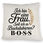 • Dieses Kissen ist ein wahrer Blickfang: Auf einem makellos weißen Hintergrund prangt selbstbewusst der Spruch "Ich bin eine Frau. Soll ich es buchstabieren? B-O-S-S". Die starken, femininen Buchstaben sind mit schimmernden Goldakzenten verziert, während ein stilisierter goldener Lorbeerkranz das elegante Design krönt.