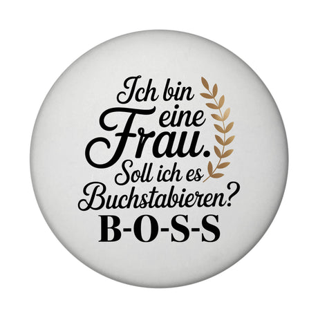 - Dieser runde Magnet "Frau ist der BOSS" vereint Eleganz und Humor. Auf einem strahlend weißen Hintergrund prahlt der selbstbewusste Spruch in femininer Schrift, begleitet von schimmernden Goldfolienakzenten. Ein goldener Lorbeerkranz krönt das Design, das Frauenpower feiert und stilvoll Empowerment verkündet. Ein wahrer Hingucker für Kühlschrank oder Büro.