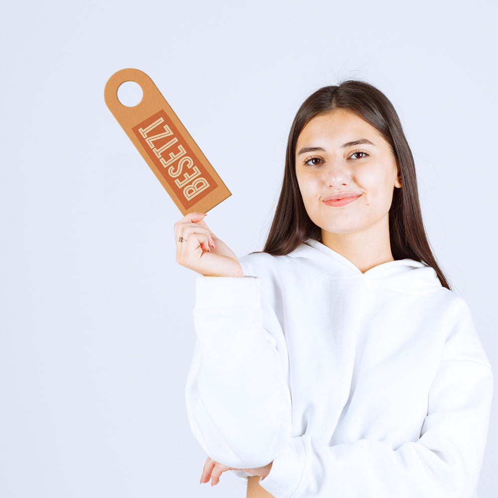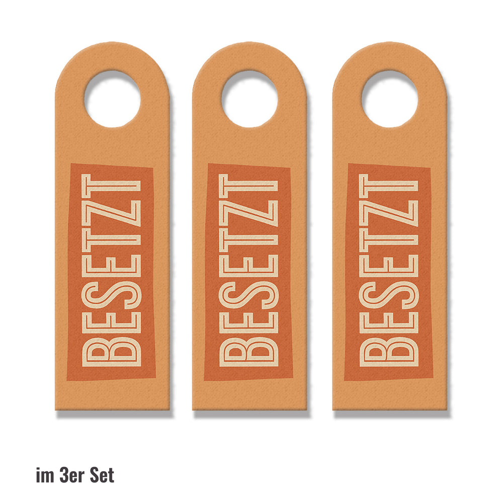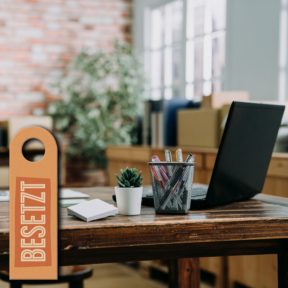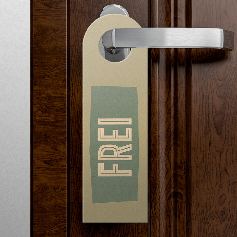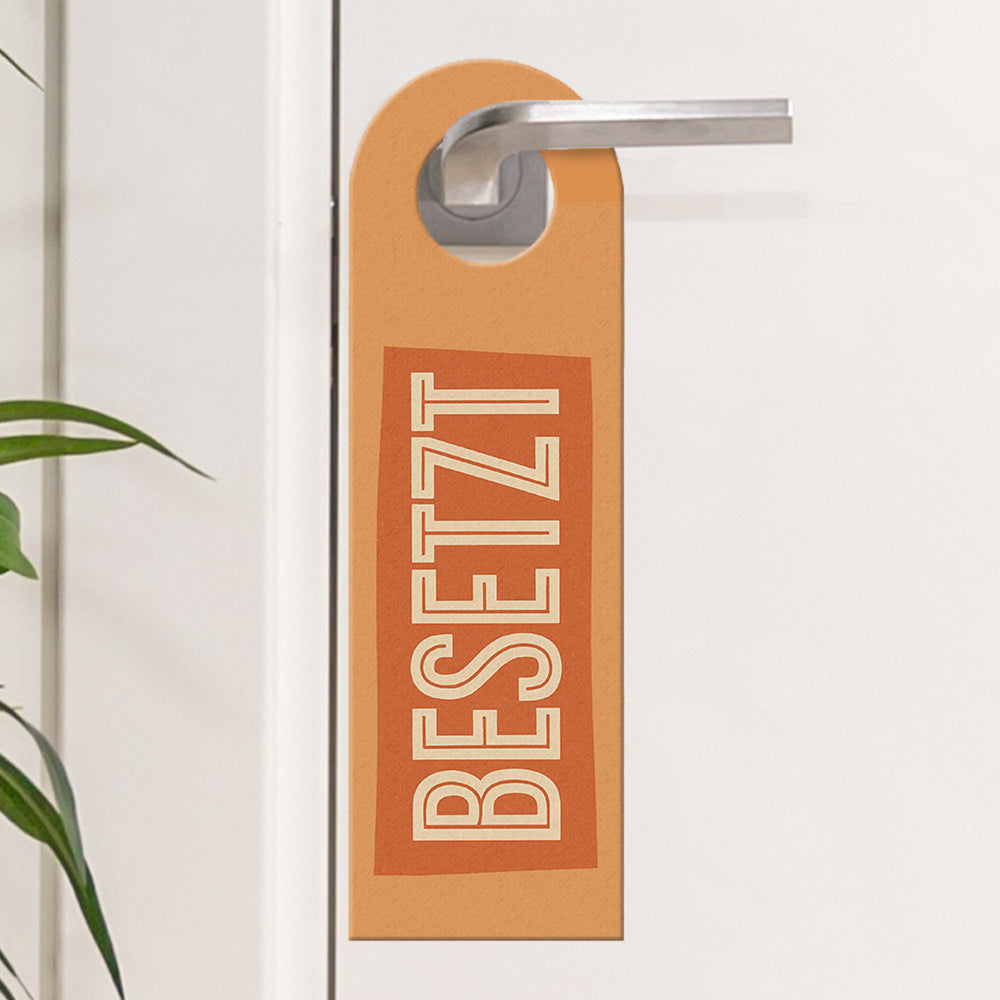 - Der Türhänger besticht durch sein praktisches Design mit zwei rechteckigen Blöcken: "BESETZT" in knalligem Orange und "FREI" in ruhigem Grün-Grau, auf beigem Hintergrund. Ein echter Hingucker, der sofort kommuniziert, ob man eintreten darf oder lieber anklopfen sollte!