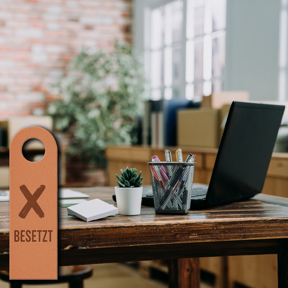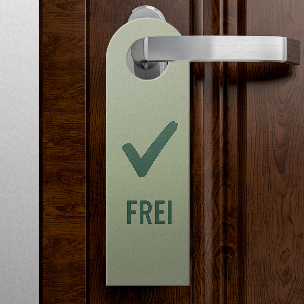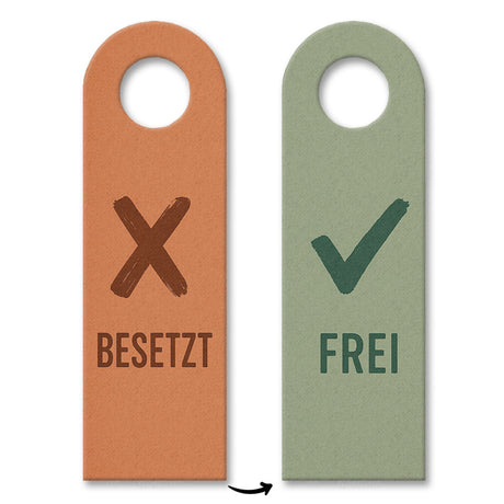 - Entdecken Sie den lustigen, aber modernen Türhänger mit Kreuz und Haken! Auf der einen Seite sehen Sie ein großes Pinselstrich-X auf orangefarbenem Hintergrund mit dem Wort "BESETZT" in fetten Buchstaben. Drehen Sie es um, und ein dunkelgrünes Häkchen auf Salbeigrün verrät mit einem klaren "FREI", dass der Weg frei ist!