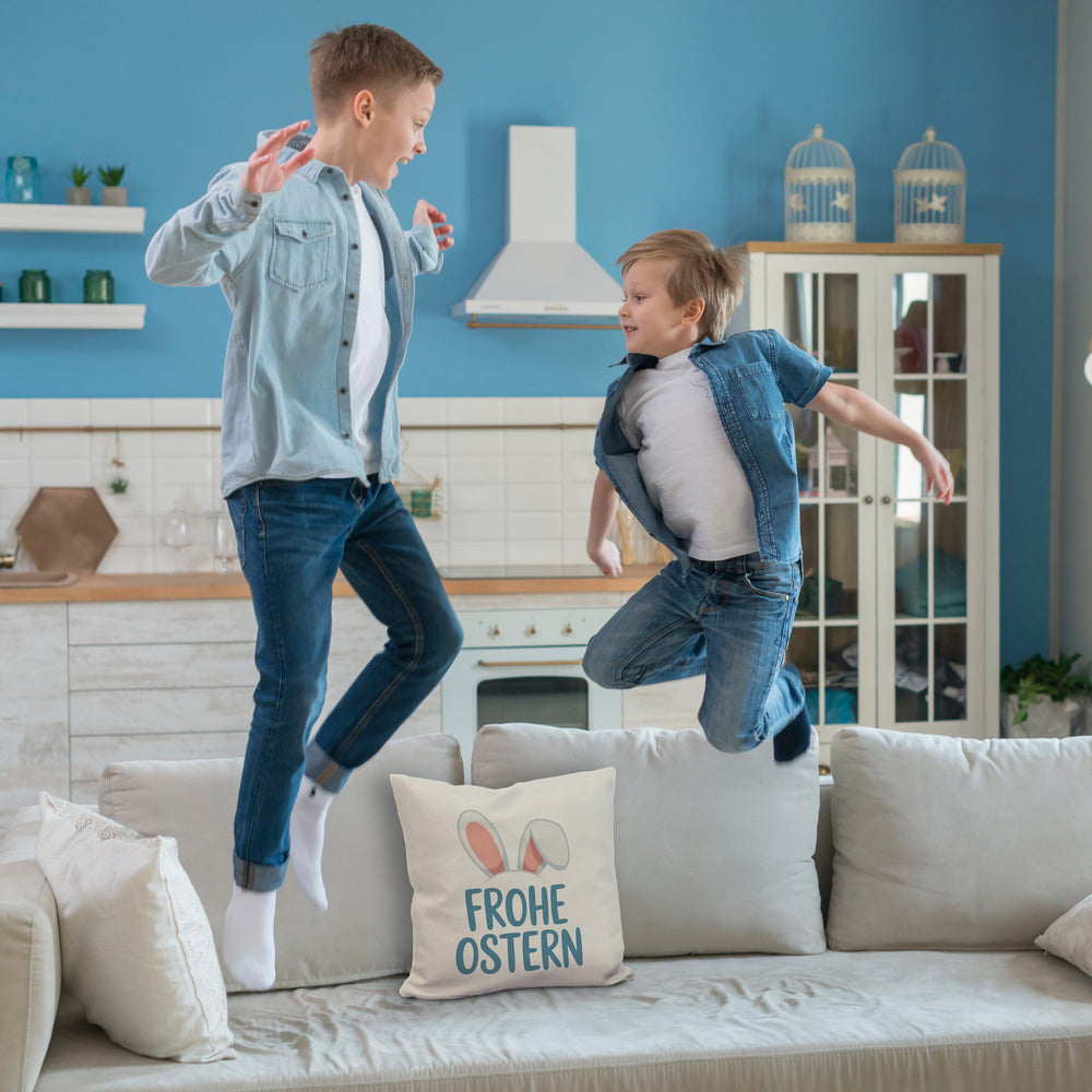 - Das Frohe Ostern Kissen begeistert mit einem minimalistischen Design: Ein rein weißer Hintergrund trägt den hellblauen Schriftzug "Frohe Ostern". Darüber ragen zwei süße Hasenohren mit zartrosa Innenseiten hervor, die einen versteckten Hasen andeuten. Die sanfte, frühlingshafte Ästhetik und die weichen Schatten machen es perfekt für jede Osterdekoration.