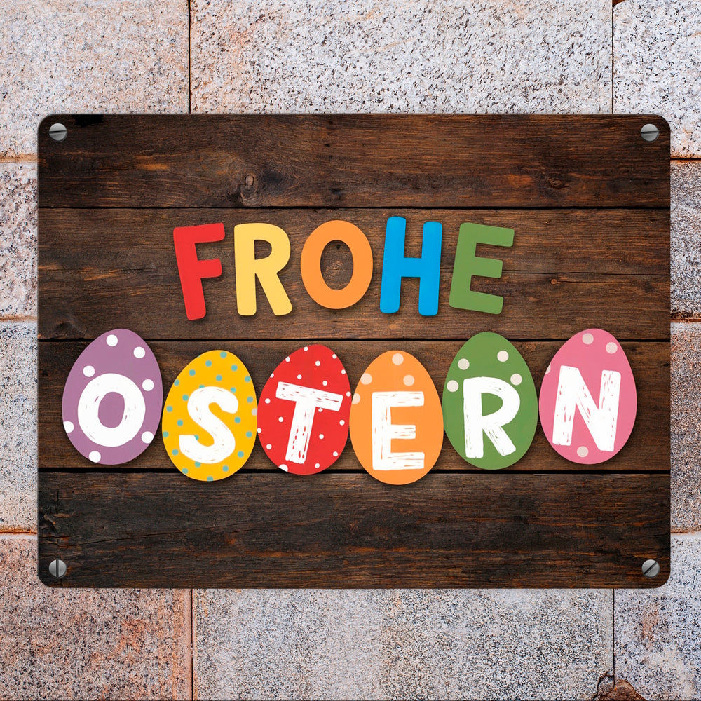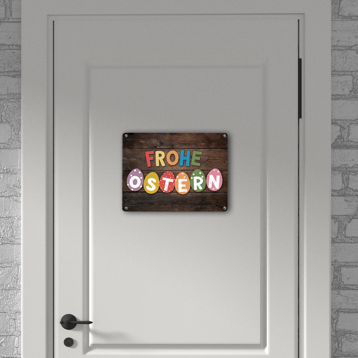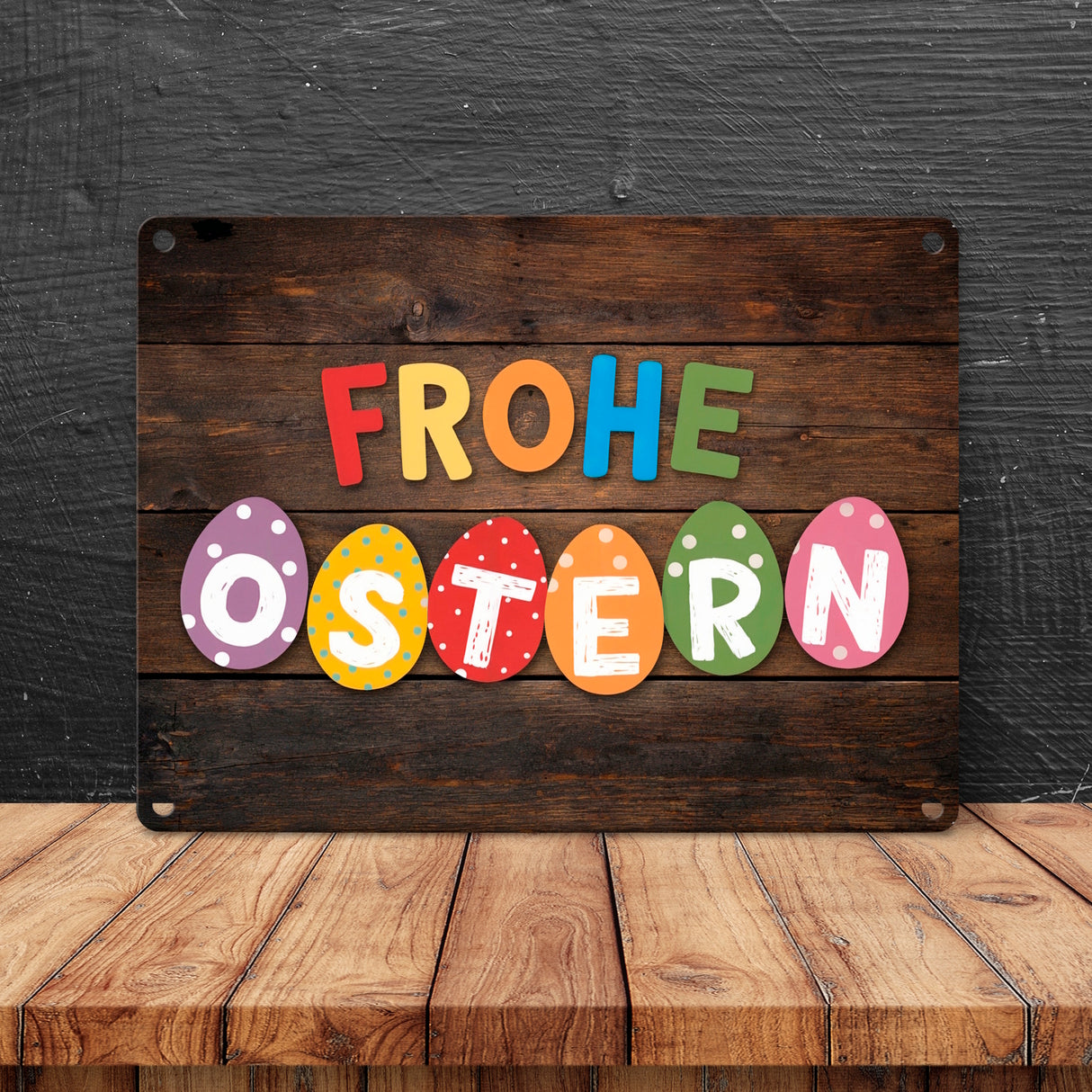 - Das fröhliche Ostern Metallschild verzaubert mit bunten Ostereiern und einem rustikalen Holzhintergrund. Der Schriftzug "Frohe Ostern" in verspielten Buchstaben, die auf eiförmigen Objekten platziert sind, bringt Schwung in jedes Zuhause. Die lebendige Gestaltung macht Lust auf den Frühling und schafft sofortige Osterstimmung!