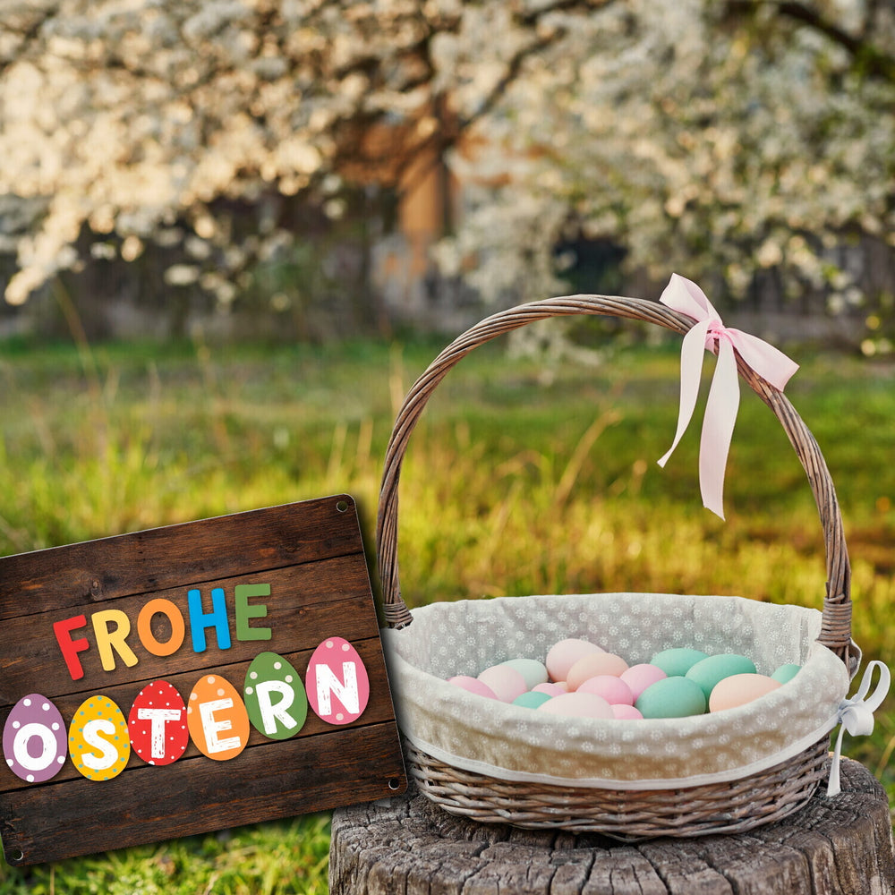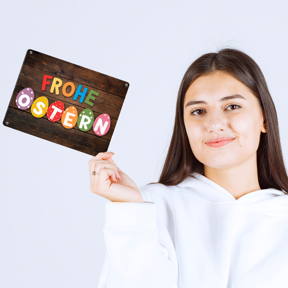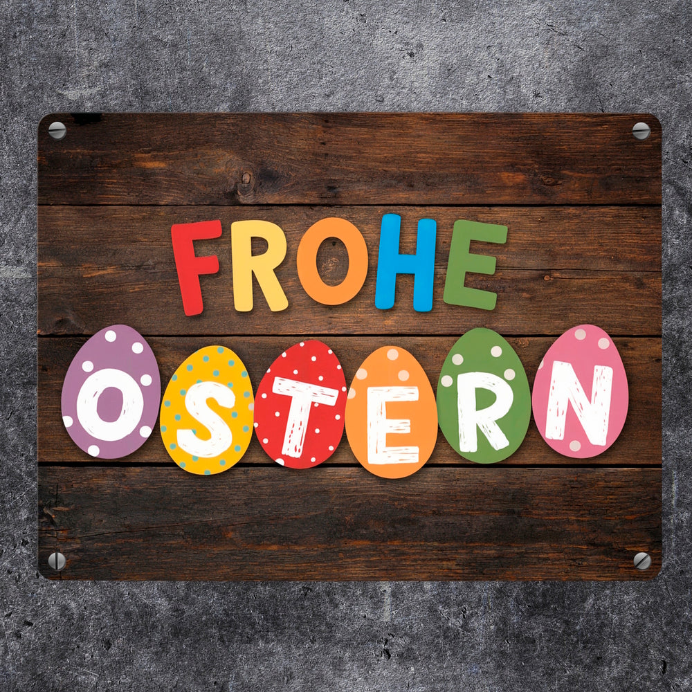 - Das fröhliche Ostern Metallschild verzaubert mit bunten Ostereiern und einem rustikalen Holzhintergrund. Der Schriftzug "Frohe Ostern" in verspielten Buchstaben, die auf eiförmigen Objekten platziert sind, bringt Schwung in jedes Zuhause. Die lebendige Gestaltung macht Lust auf den Frühling und schafft sofortige Osterstimmung!