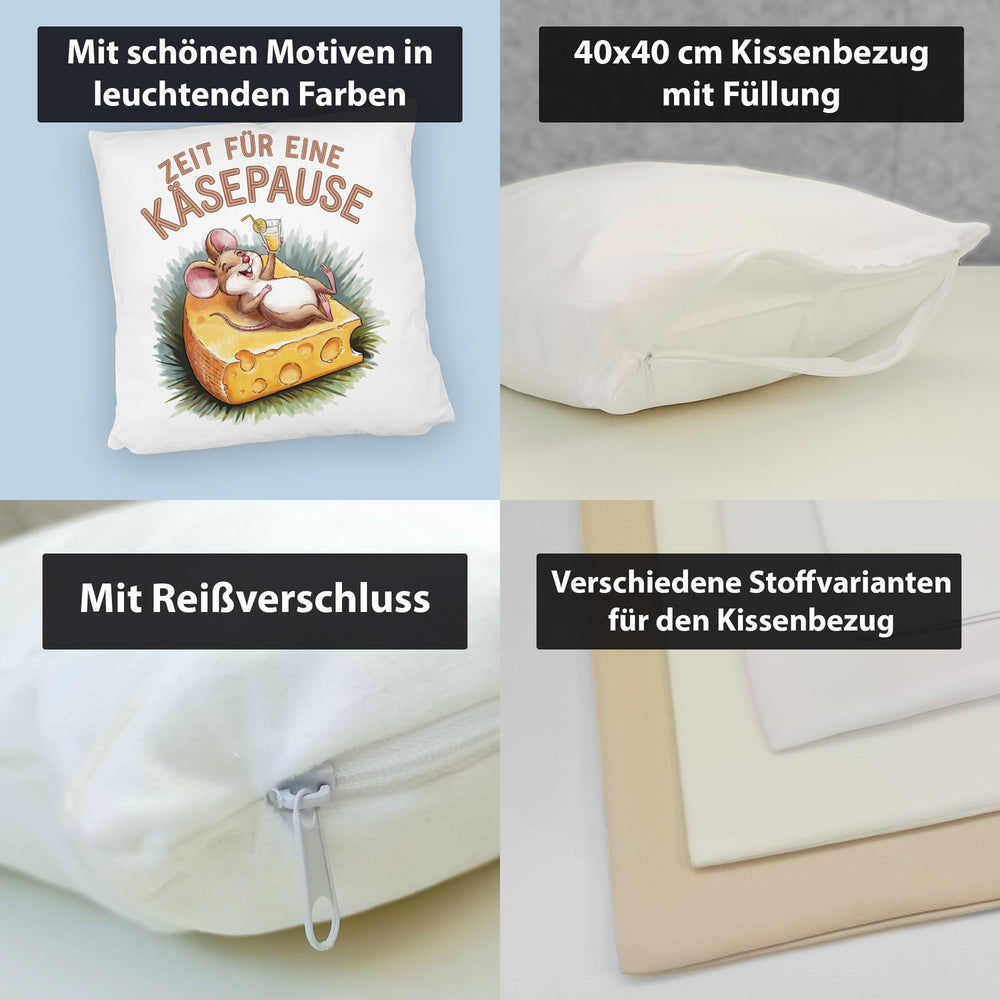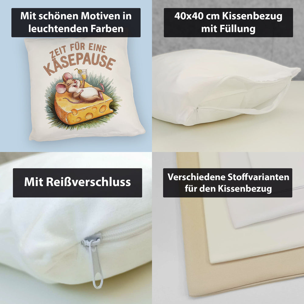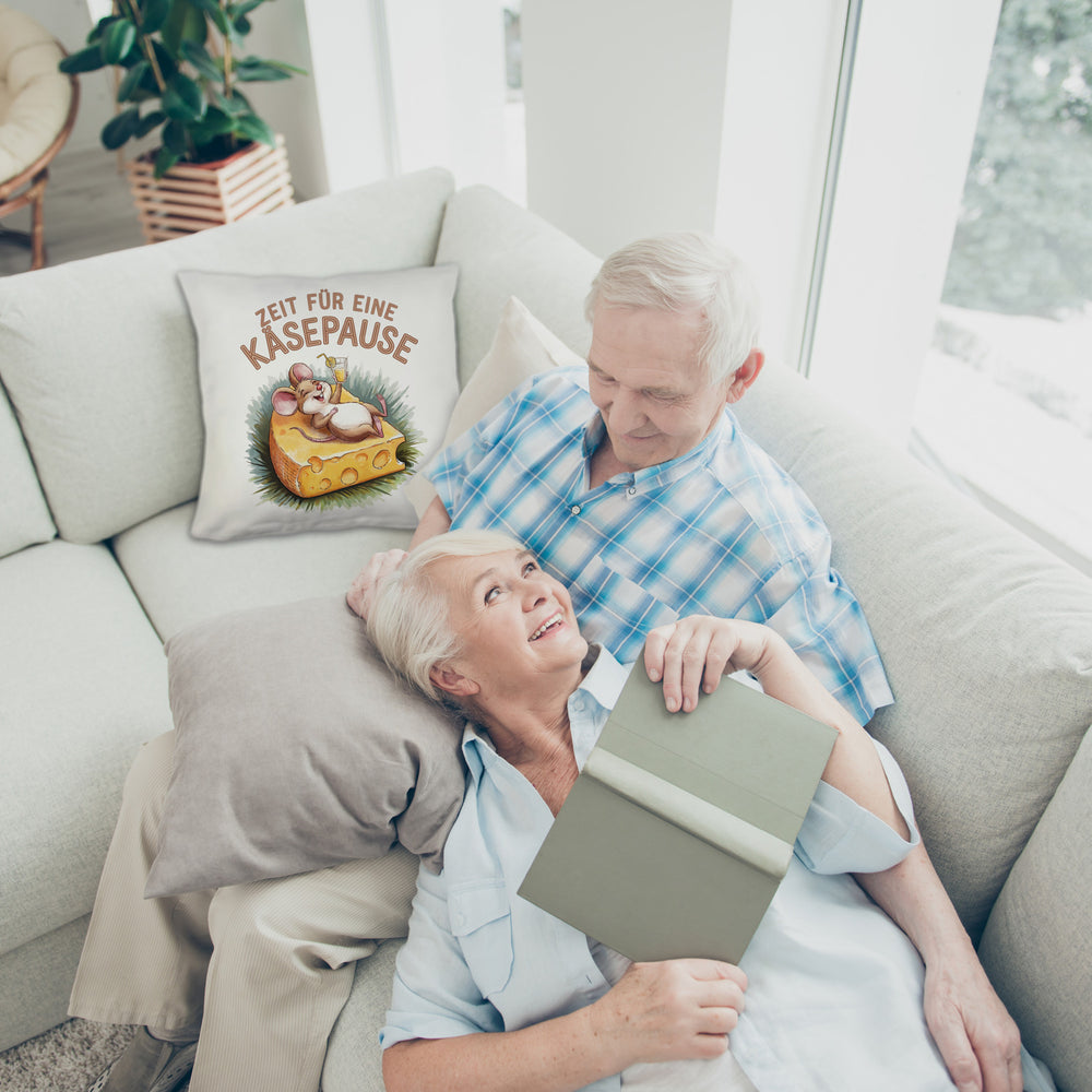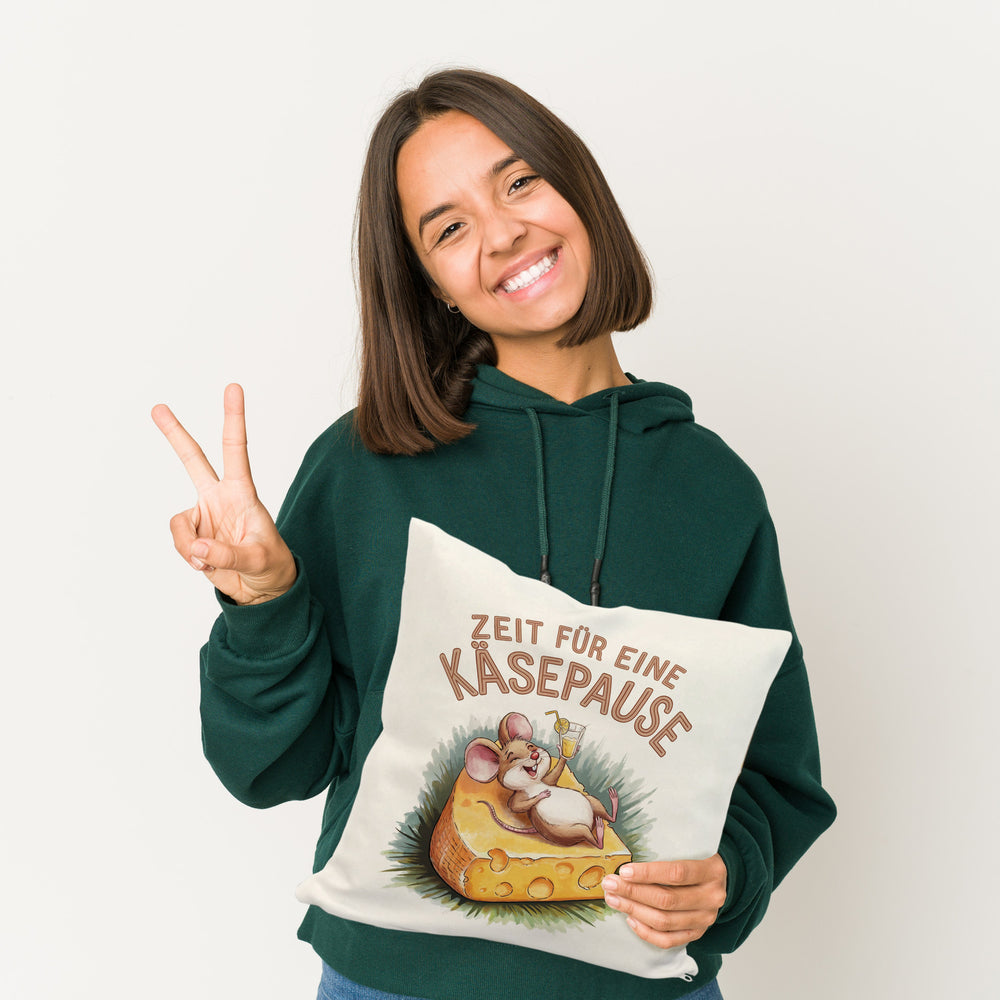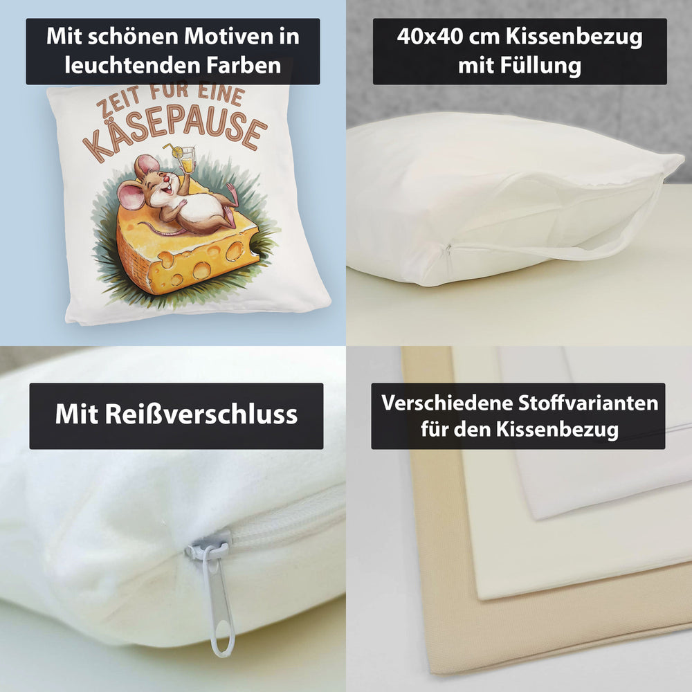 - Dieses lustige Dekokissen zeigt eine fröhliche Maus, die entspannt auf einer großen Käsescheibe liegt. Der weiße Hintergrund wird durch eine bunte Aquarellzeichnung und den Spruch "Zeit für eine Käsepause" in Großbuchstaben ergänzt. Die fröhlichen Farben machen dieses Kissen zu einem echten Hingucker!