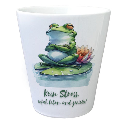 Frosch auf Seerose Blumentopf mit Spruch Kein Stress einfach leben und genießen