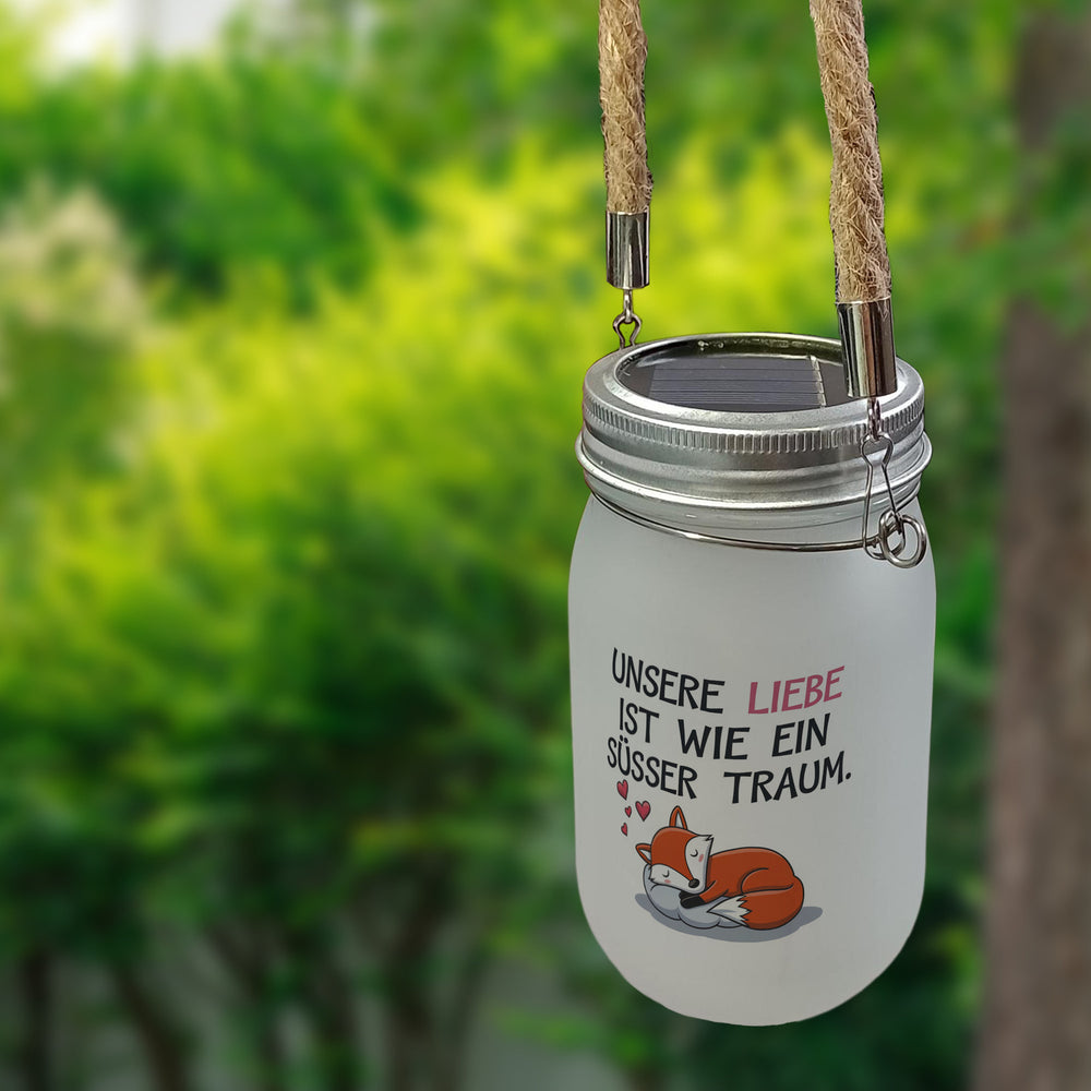 - Dieses Solarlicht präsentiert eine entzückende Illustration eines schlafenden Fuchses auf einer Wolke, träumend von Herzen. Umrahmt von einem romantischen Spruch: "Unsere Liebe ist wie ein süßer Traum", heben die lebendigen Farben auf weißem Hintergrund das liebevolle Design hervor und schaffen eine fröhliche Atmosphäre.
